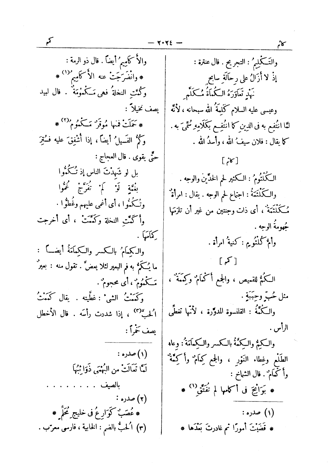 حَمَلَتِ فمنها موقَرٌ مكموم (¬2) * وكم الفسيل أيضا، إذا أشفق عليه فسُتِرَ حتَّى يقوى. قال العجاج: بل لو شَهِدْتَ الناس إذ تُكُمُّوا بغُمَّةٍ لو لم تُفَرَّجْ غُمُّوا وتُكُمُّوا، أي أغمي عليهم وغُطُّوا. وأَكَمَّتِ النخلة وكَمَّمَتْ، أي أخرجت كِمامَها. والكِمامُ بالكسر والكِمامَةُ أيضاً: ما يُكَمُّ به فم البعير لئلا يعضّ. تقول منه: بعيرٌ مَكْمومٌ، أي محجومٌ. وكممت الشئ: غطيته. يقال كممت الحُبَّ (¬3) ، إذا شددت رأسه. قال الاخطل يصف خمرا