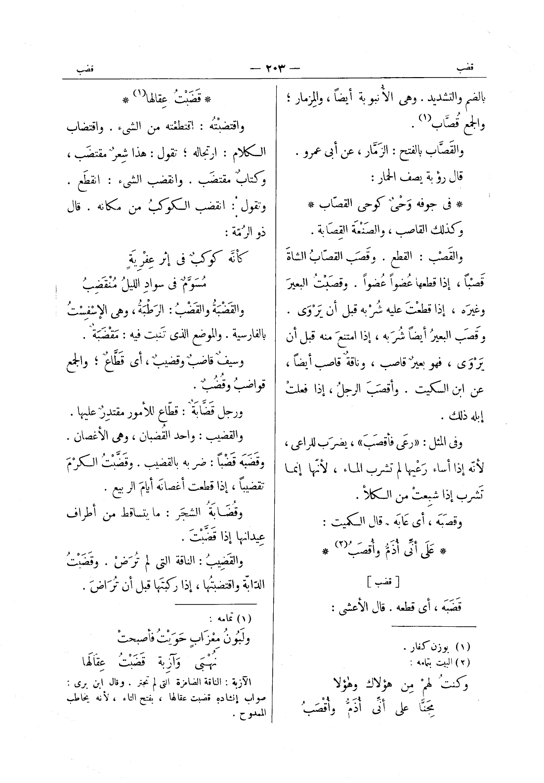 * قضبت عقالها (¬1) * واقتضبته: اقتطعته من الشئ. واقتضاب الكلام: ارتجاله، تقول: هذا شعرٌ مقتضَب، وكتاب مقتضب. وانقضب الشئ: انقطع. وتقول: انقضب الكوكبُ من مكانه. قال ذو الرمّة: كأنَّه كوكبٌ في إثر عِفْرِيَةٍ * مُسَوَّمٌ في سوادِ الليلُ مُنْقَضِبُ والقَضْبَةُ والقَضْبُ: الرَطْبَةُ، وهي الإسْفِسْتُ بالفارسية. والموضع الذي تَنبت فيه: مَقْضَبَةٌ. وسيفٌ قاضبٌ وقضيبٌ، أي قَطَّاعٌ، والجمع قواضبُ وقُضُبٌ. ورجل قَضَّابَةٌ: قطّاع للأمور مقتدِرٌ عليها. والقضيب: واحد القُضبان، وهي الأغصان. وقَضَبَه قَضْباً: ضربه بالقضيب. وقَضَّبْتُ الكرْمَ تقضيباً، إذا قطعت أغصانَه أيامَ الربيع. وقُضابَةُ الشجر: ما يتساقط من أطراف عيدانها إذا قَضَّبْتَ. والقَضيبُ: الناقة التي لم تُرَضْ. وقَضَبْتُ الدابّة واقتضبتُها، إذا ركبتَها قبل أن تراض.