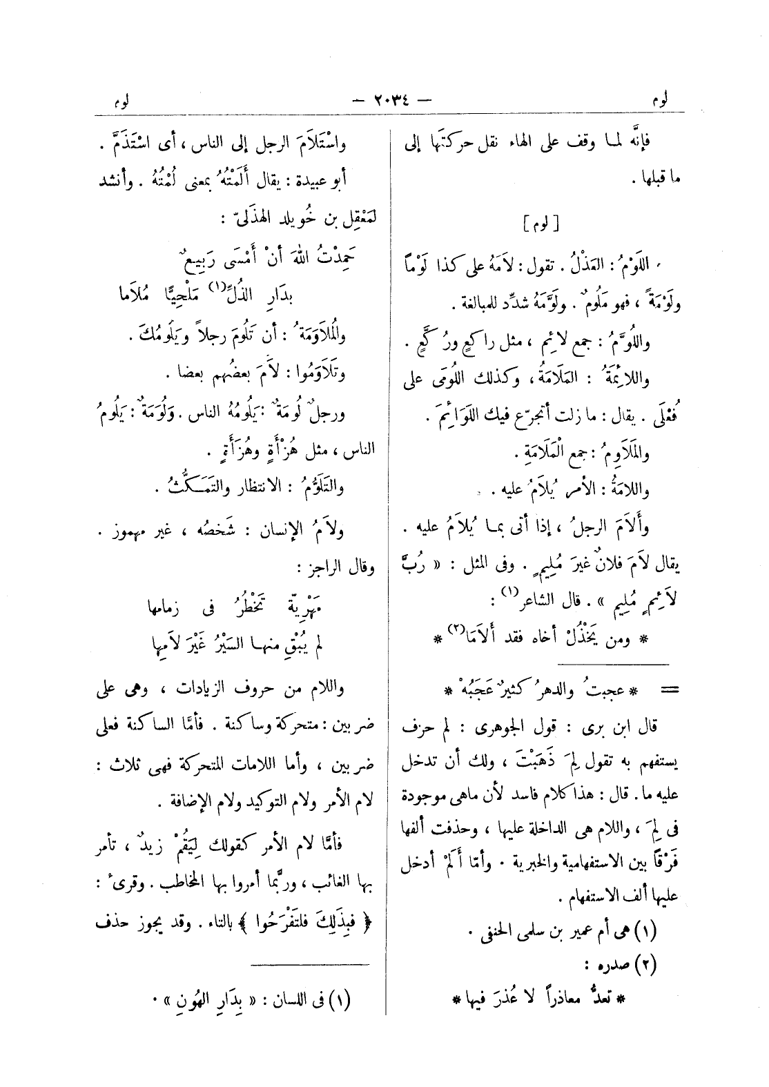 واسْتَلامَ الرجل إلى الناس، أي اسْتَذَمَّ. أبو عبيدة: يقال ألَمْتُهُ بمعنى لُمْتُهُ. وأنشد لمَعْقِل بن خويلد الهذَلي: حَمِدْتُ اللهَ أن أمْسى رَبيعٌ بدارِ الذُلِّ (¬1) مَلْحِيًَّا مُلاما والمُلاوَمَةُ: أن تَلومَ رجلاً ويَلومُكَ. وتَلاوَموا: لامَ بعضُهم بعضاً. ورجلٌ لومَةٌ: يَلومُهُ الناس. ولُوَمَةٌ: يلوم الناس، مثل هزأة وهزأة. والتلوم: الانتظار والتمكث. ولامُ الإنسان: شَخصُه، غير مهموز. وقال الراجز: مَهْرِيَّة تَخْطُرُ في زمامها لم يبق منها السير غير لامها واللام من حروف الزيادات، وهى على ضربين: متحركة وساكنة. فأما الساكنة فعلى ضربين، وأما اللامات المتحركة فهى ثلاث: لام الامر ولام التوكيد ولام الاضافة. فأما لام الامر كقولك ليقم زيد، تأمر بها الغائب، وربما أمروا بها المخاطب. وقرئ: (فبذلك فلتفرحوا) بالتاء. وقد يجوز حذف