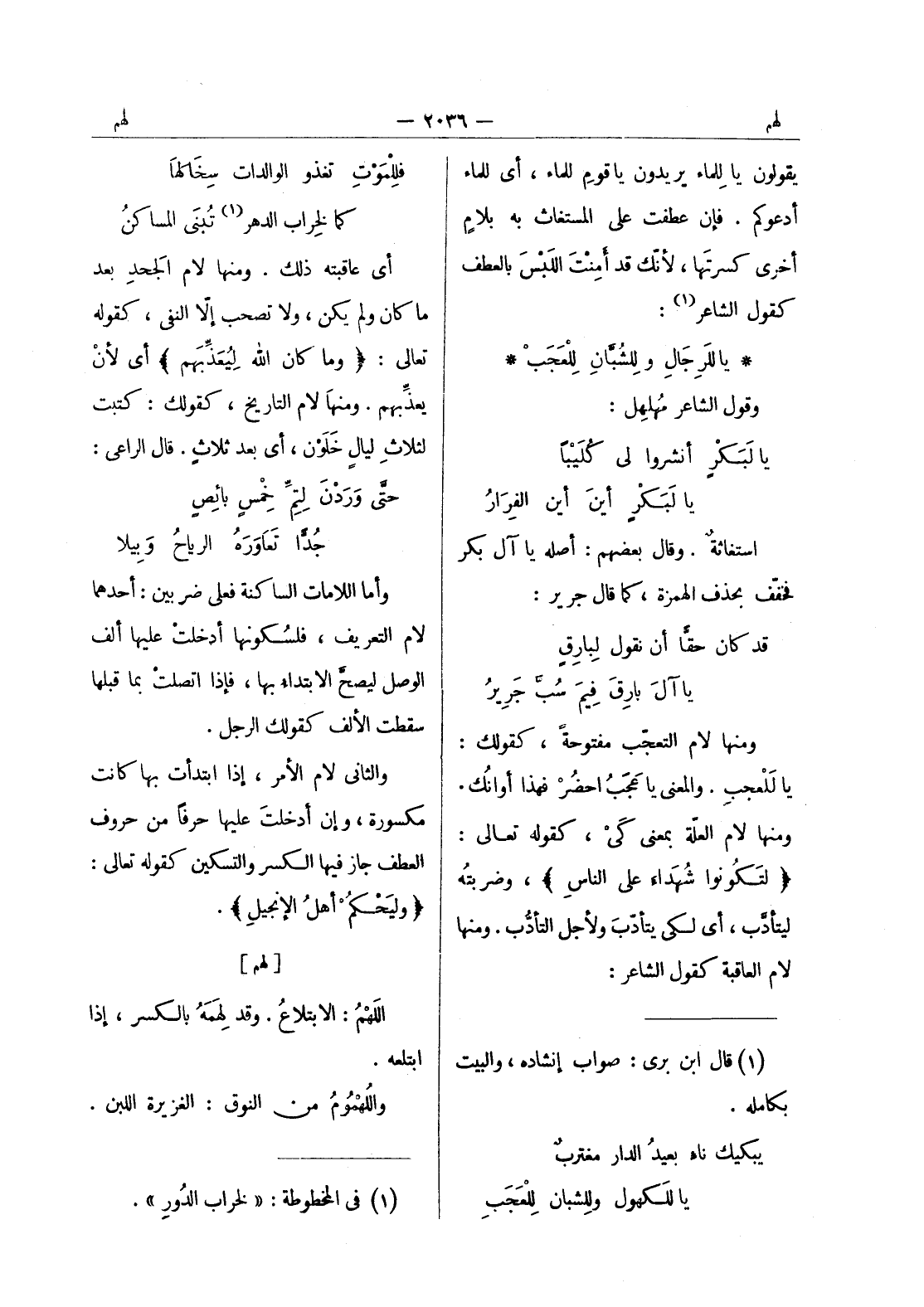 يا للرجال وللشبان للعجب * وقول الشاعر مهلهل: يا لبكر أنشروا لى كليبا يا لبكر أين أين الفرار استغاثة. وقال بعضهم: أصله يا آل بكر فخفف بحذف الهمزة، كما قال جرير: قد كان حقا أن نقول لبارق يا آل بارق فيم سب جرير ومنها لام التعجب مفتوحة، كقولك: يا للعجب. والمعنى يا عجب احضر فهذا أوانك. ومنها لام العلة بمعنى كى، كقوله تعالى: (لتكونوا شهداء على الناس) ، وضربته ليتأدب، أي لكى يتأدب ولاجل التأدب. ومنها لام العاقبة كقول الشاعر