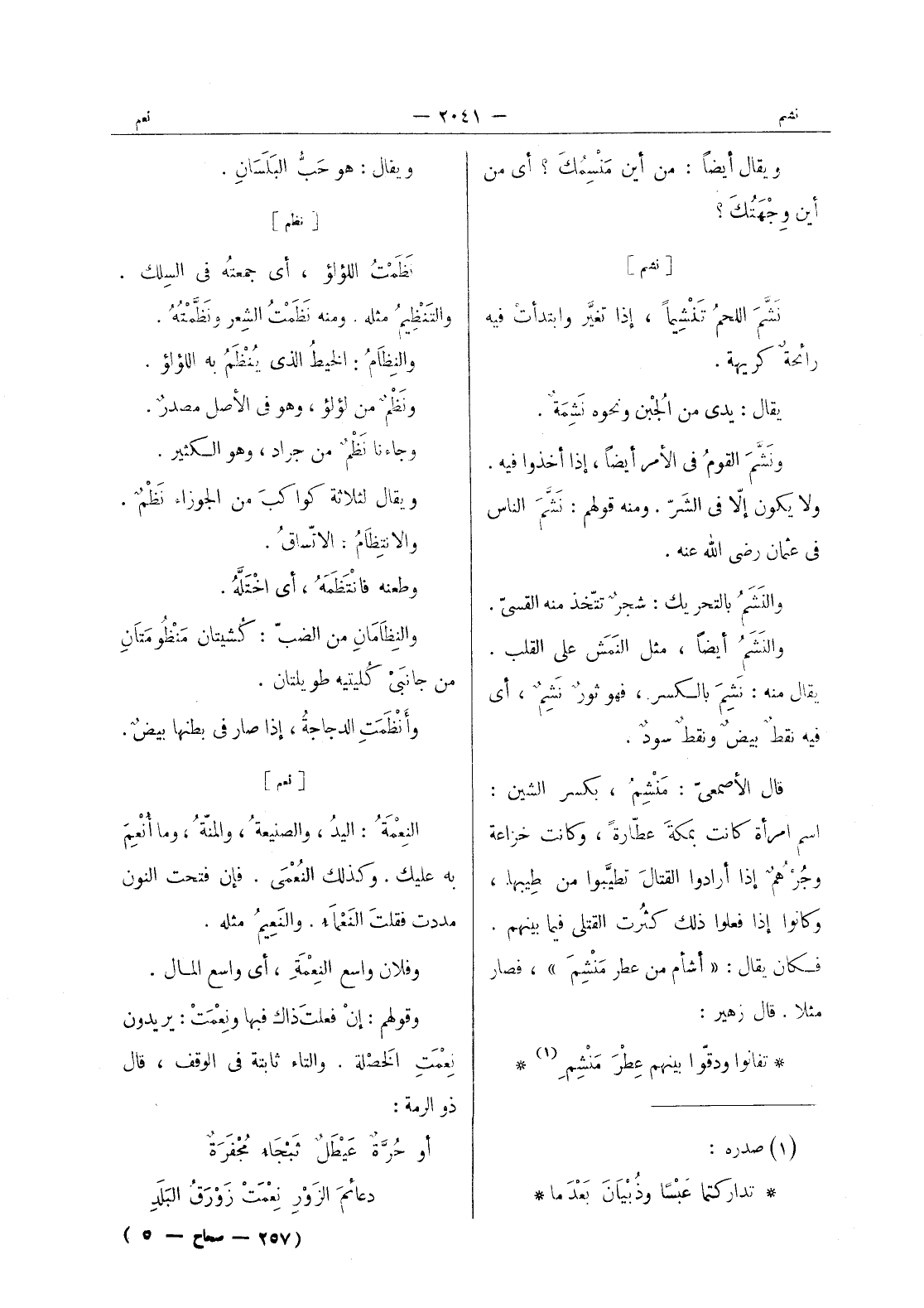 [نظم] نَظَمْتُ اللؤلؤ، أي جمعتُهُ في السِلك والتَنْظيمُ مثله. ومنه نَظَمْتُ الشِعر ونَظَّمْتُهُ. والنِظامُ: الخيطُ الذي يُنْظَمُ به اللؤلؤ. ونَظْمٌ من لؤلؤ، وهو في الأصل مصدرٌ. وجاءنا نَظْمٌ من جراد، وهو الكثير. ويقال لثلاثة كواكبَ من الجوزاء نَظْمٌ. والانتِظامُ: الاتِّساقُ. وطعنه فانْتَظَمَهُ، أي اختلَّهُ. والنِظامانِ من الضبّ: كُشيتان مَنْظُومَتانِ من جانبي كُليتيه طويلتان. وأَنْظَمَتِ الدجاجةُ، إذا صار في بطنها بيضٌ.