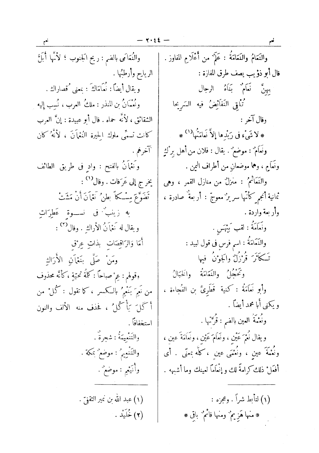 (*) والنعامى بالضم: ريح الجنوب، لأنَّها أبَلُّ الرِياحِ وأرطبُها. ويقال أيضاً: نُعاماكَ: بمعنى قصاراك. ونعمان بن المنذر: ملك العرب، نسب إليه الشقائق، لانه حماه. قال أبو عبيدة: إن العرب كانت تسمى ملوك الحيرة النعمان، لانه كان آخرهم. ونعمان بالفتح: واد في طريق الطائف يخرج إلى عرفات. وقال (¬1) : تَضَوَّعَ مِسْكاً بَطْنُ نَعْمانَ أنْ مَشَتْ به زَيْنَبٌ في نِسْوَةٍ عطرات ويقال له نعمان الاراك. وقال (¬2) : أما والراقصات بذات عرق ومن صلى بنعمان الاراك وقولهم: عم صباحا: كلمةُ تحيَّةٍ، كأنَّه محذوف من نَعِمَ يَنْعِمُ بالكسر، كما تقول: كل من أكل يأكل، فحذف منه الالف والنون استخفافا. والتنعيمة: شجرة. والتنعيم: موضع بمكة. وأنيعم: موضع.