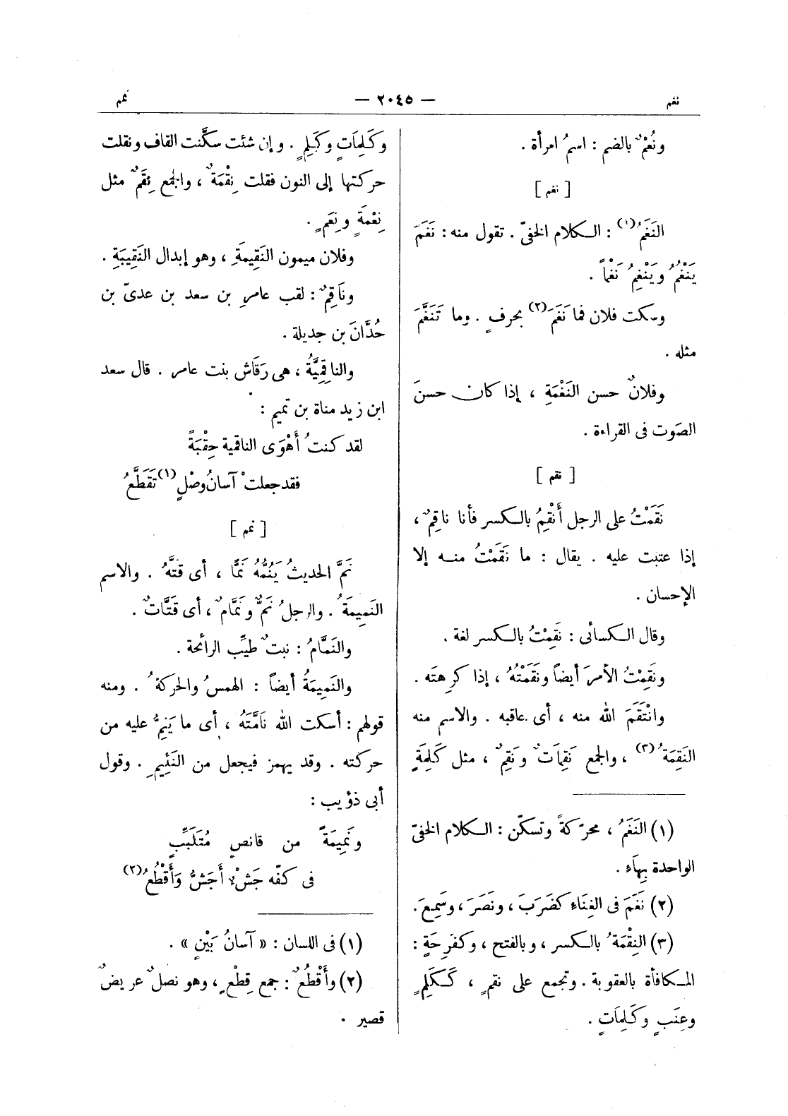 [تقم] نقمت على الرجل أنقم بالكسر فأنا ناقِمٌ، إذا عتبت عليه. يقال: ما نَقَمْتُ منه إلا الإحسان. وقال الكسائي: نَقِمْتُ بالكسر لغة. ونَقِمْتُ الأمرَ أيضاً ونَقَمْتُهُ، إذا كرهته. وانْتَقَمَ الله منه، أي عاقبه. والاسم منه النقمة (¬3) ، والجمع نقمات ونقم، مثل كلمة