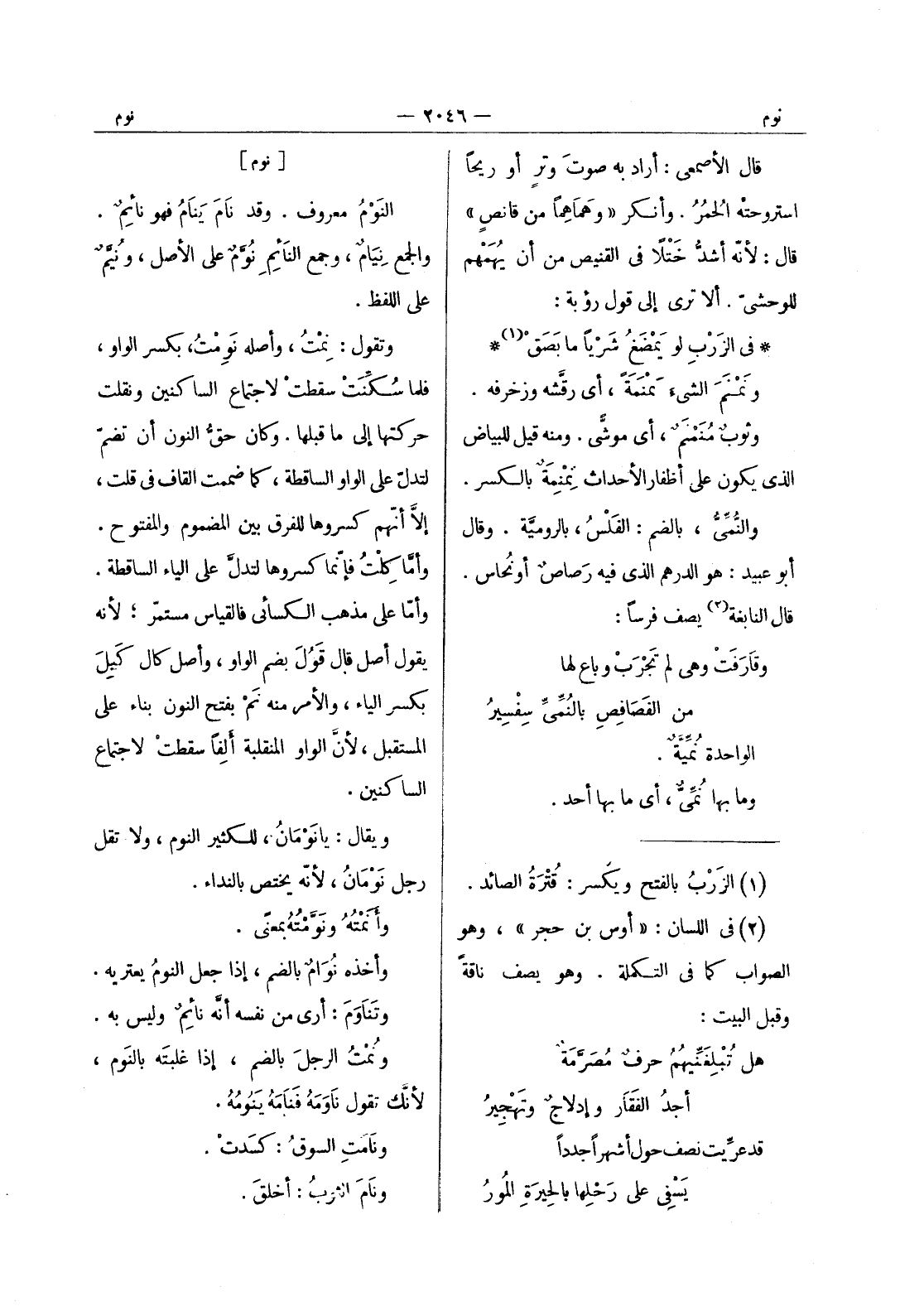 [نوم] النَوْمُ معروف. وقد نامَ يَنامُ فهو نائِمٌ. والجمع نِيامٌ، وجمع النائِمِ نُوَّمٌ على الأصل، ونيم على اللفظ. وتقول: نمت، وأصله نومت، بكسر الواو، فما سكنت سقطت لاجتماع الساكنين ونقلت حركتها إلى ما قبلها. وكان حق النون أن تضم لتدل على الواو الساقطة، كما ضممت القاف في قلت، إلا أنهم كسروها للفرق بين المضموم والمفتوح. وأما كلت فإنما كسروها لتدل على الياء الساقطة. وأما على مذهب الكسائي فالقياس مستمر، لانه يقول أصل قال قول بضم الواو، وأصل كال كيل بكسر الياء والامر منه نم بفتح النون بناء على المستقبل، لان الواو المنقلبة ألفا سقطت لاجتماع الساكنين. ويقال: يا نَوْمانُ، للكثير النوم، ولا تقل رجل نَوْمانُ، لأنه يختص بالنداء. وأنَمْتُهُ ونَوَّمْتُهُ بمعنًى. وأخذه نُوامٌ بالضم، إذا جعل النومُ يعتريه. وتَناوَمَ: أرى من نفسه أنَّه نائِمٌ وليس به. ونُمْتُ الرجلَ بالضم، إذا غلبتَه بالنَوم، لأنَّك تقول ناوَمَهُ فَنامَهُ يَنومُهُ. ونامَتِ السوقُ: كسَدت. ونامَ الثوبُ: أخلقَ.