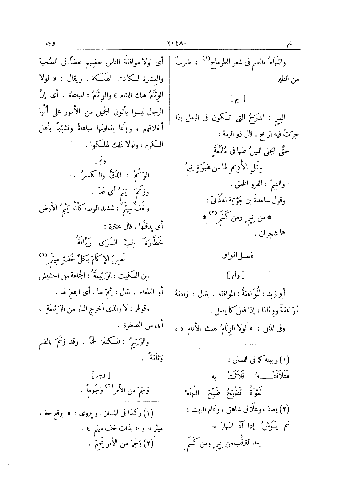 (وثم] الوَثْمُ: الدَقُّ والكسرُ. ووَثَمَ يَثِمُ أي عَدا. وخُفٌّ مِيثَمٌ: شديد الوطئ كأنه يثم الارض أي يدقُّها. قال عنترة: خَطَّارَةٌ غِبَّ السُرى زيَّافَةٌ تَطِسُ الإكامَ بكلِّ خُفٍّ مِيثَمِ (¬1) ابن السكيت: الوَثيمَةُ: الجماعة من الحشيش أو الطعام. يقال: ثِمْ لها، أي اجمع لها. وقولهم: لا والذي أخرج النار من الوَثيمَةِ، أي من الصخرة. والوَثيمُ: المكتنز لحماً. وقد وثم بالضم وثامة.