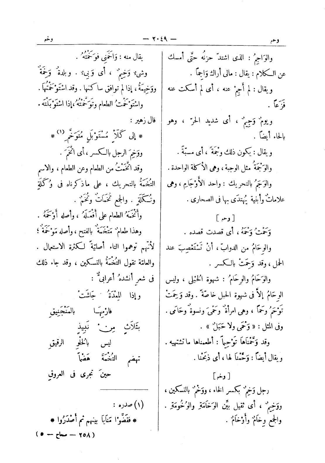 [وحم] وَحَمْتُ وَحْمَهُ، أي قصدت قصده. والوِحامُ من الدوابّ، أن تَسْتعْصِبَ عند الحمل، وقد وَحِمَتْ بالكسر. والوَحامُ والوِحامُ: شهوة الحُبلى، وليس الوِحامُ إلاّ في شهوة الحبل خاصَّةً. وقد وَحِمَتْ تَوْحَمُ وَحماً، وهي امرأةٌ وَحْمَى ونسوةٌ وحامى. وفي المثل: " وَحْمَى ولا حَبَلٌ ". وقد وَحَّمناها تَوْحيماً: أطعمناها ما تشتهيه. ويقال أيضاً: وَحَّمنا لها، أي ذبحنا.