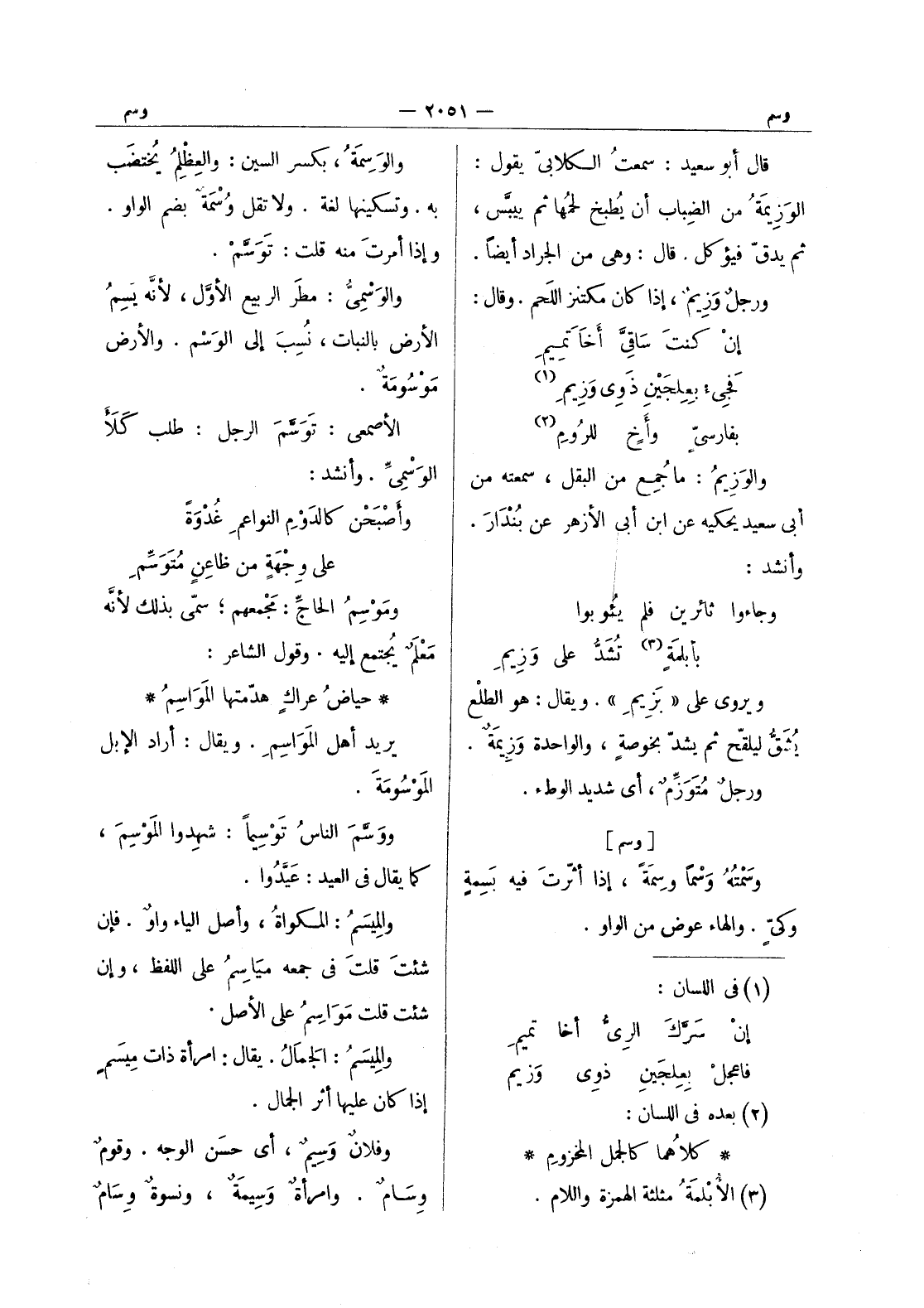 (*) والوسمة، بكسر السين: والعِظْلِمُ يُختضَب به. وتسكينها لغة. ولا تقل وُسْمَةٌ بضم الواو. وإذا أمرت منه قلت: توَسَّمَ. والوَسْمِيُّ: مطر الربيع الأوَّل، لأنَّه يسِمُ الأرض بالنبات، نُسِبَ إلى الوَسْم. والأرض مَوْسومَةٌ. الأصمعيّ: تَوَسَّمَ الرجل: طلب كَلأَ الوَسْمِيِّ. وأنشد: وأَصْبَحْنَ كالدَوْمِ النواعمِ غُدْوَةً على وِجهةٍ من ظاعِنٍ مُتَوَسَّمِ ومَوْسِمُ الحاجِّ: مَجْمعهم، سمِّي بذلك لانه معلم يجتمع إليه. وقول الشاعر: