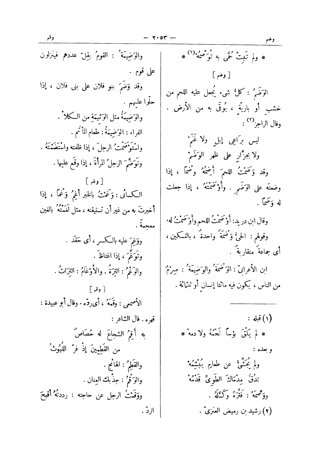 (*) والوضيمة: القومُ يقِلُّ عددهم فينزلون على قوم. وقد وَضَمَ بنو فلان على بني فلان، إذا حلُّوا عليهم. والوَضيمَةُ مثل الوَثيمَةِ من الكلأ. الفراء: الوَضيمَةُ: طعام المأتم. واسْتَوْضَمْتُ الرجلَ، إذا ظلمته واسْتَضَمْتَهُ. وتَوَضَّمَ الرجلُ المرأةَ، إذا وقع عليها.