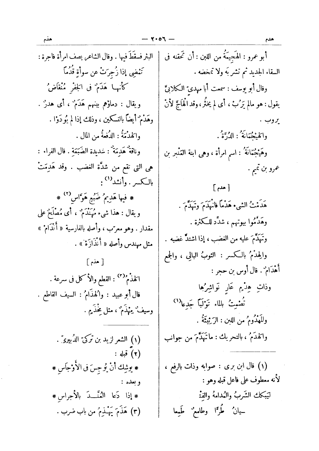 البئر فسقط فيها. وقال الشاعر يصف امرأة فاجرة: تمضي إذا زُجِرَتْ عن سَوْأةٍ قُدُماً كأنها هَدَمٌ في الجَفْرِ مُنْقاضُ ويقال: دماؤهم بينهم هَدَمٌ، أي هَدرٌ. وهَدْمٌ أيضاً بالتسكين، وذلك إذا لم يُودَوْا. والهَدْمَةُ: الدفعة من المال. وناقة هَدِمَةٌ: شديدةُ الضَبَعَةِ. قال الفراء: هي التي تقع من شدَّة الغضب. وقد هدمت بالكسر. وأنشد (¬1) :