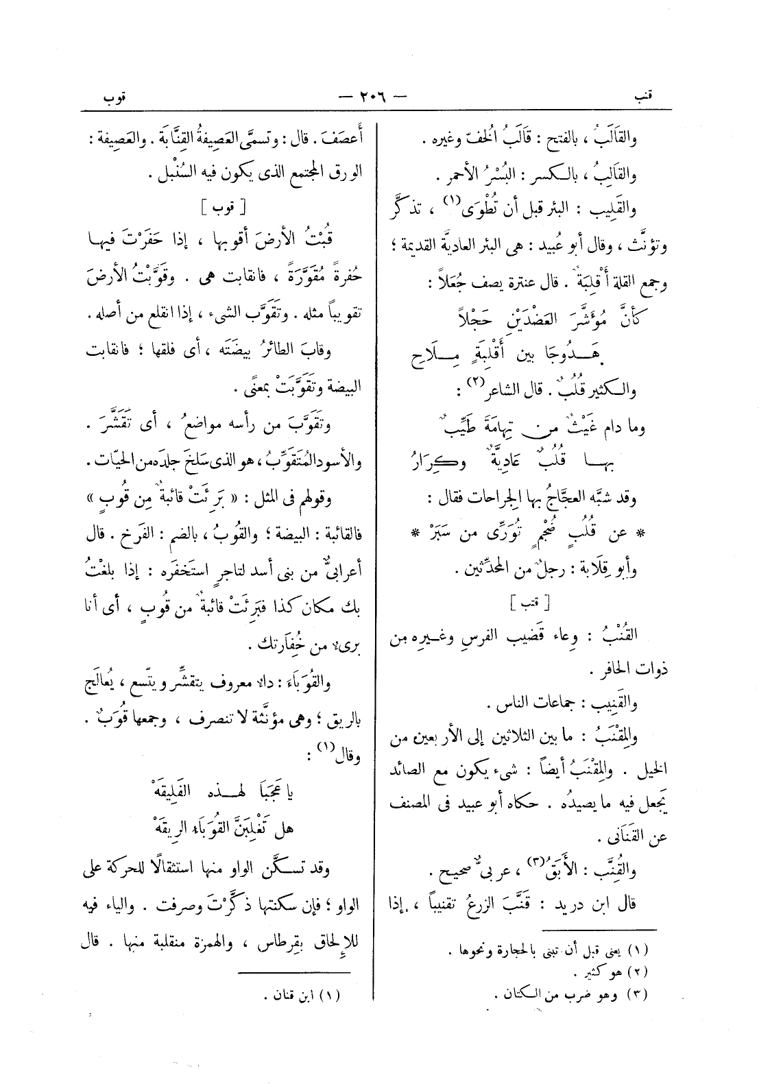 [قوب] قُبْتُ الأرضَ أقوبها، إذا حفرت فيها حُفرةً مُقَوَّرَةً، فانقابت هي. وقَوَّبْتُ الأرضَ تقويباً مثله. وتقوب الشئ، إذا انقلع من أصله. وقابَ الطائرُ بيضَتَه، أي فلقها، فانقابت البيضة وتَقَوَّبَتْ بمعنًى. وتَقَوَّبَ من رأسه مواضعُ، أي تَقَشَّرَ. والأسود المُتَقَوِّبُ، هو الذي سَلَخَ جلدَه من الحيّات. وقولهم في المثل: " بَرِئَتْ قائبةٌ من قوبٍ " فالقائبة: البيضة، والقوبُ، بالضم: الفَرخ. قال أعرابيٌّ من بني أسد لتاجرٍ استَخفَره: إذا بلغْتُ بك مكان كذا فبَرِئَتْ قائبةٌ من قوب، أي أنا برئ من خِفارتك. والقُوَباءَ: داءٌ معروف يتقشّر ويتّسع، يُعالج بالريق: وهي مؤنَّثة لا تنصرف، وجمعها قُوَبٌ. وقال (¬1) : يا عجبا لهذه الفليقه * هل تغلبن القوباء الريقه وقد تسكَّن الواو منها استثقالاً للحركة على الواو، فإن سكَّنتها ذكرت وصرفت. والياء فيه للالحاق بقرطاس، والهمزة منقلبة منها. قال