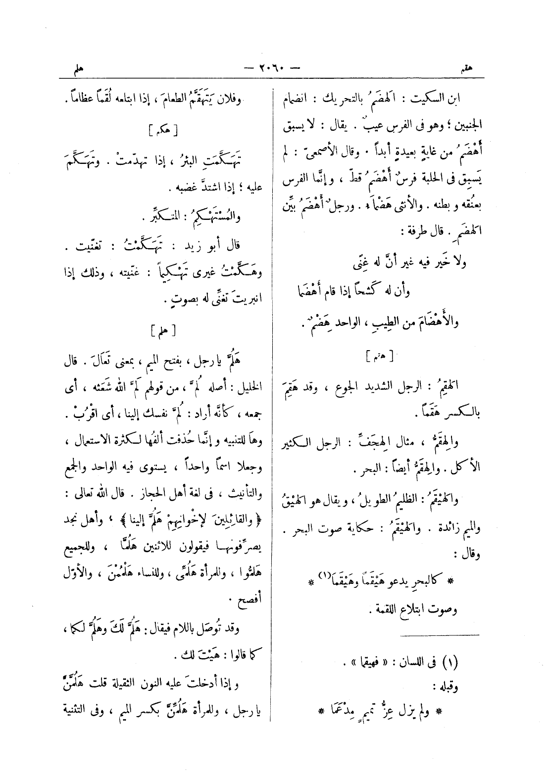 [هلم] هَلُمَّ يا رجل، بفتح الميم، بمعنى تعال. قال الخليل: أصله لم، من قولهم لم الله شعثه، أي جمعه، كأنه أراد: لم نفسك إلينا، أي اقرب. وها للتنبيه وإنما حذفت ألفها لكثرة الاستعمال، وجعلا اسما واحدا، يستوى فيه الواحد والجمع والتأنيث، في لغة أهل الحجاز. قال الله تعالى: (والقائِلينَ لإخْوانِهِمْ هَلُمَّ إلينا) ، وأهل نجد يصرِّفونها فيقولون للاثنين هَلُمَّا، وللجميع هلموا، وللمرأة هلمى، وللنساء هَلْمُمْنَ، والأول أفصح. وقد تُوصَل باللام فيقال: هَلُمَّ لكَ وهَلُمَّ لكما، كما قالوا: هَيْتَ لك. وإذا أدخلت عليه النون الثقيلة قلت هَلُمَّنَّ يا رجل، وللمرأة هَلُمِّنَّ بكسر الميم، وفي التثنية