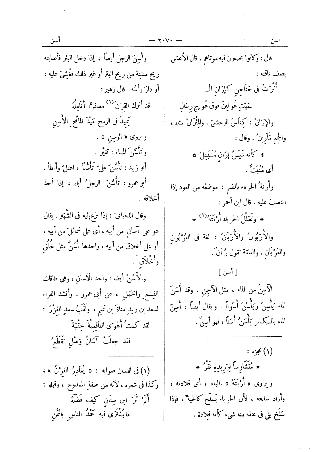وأسن الرجل أيضا، إذا دخل البئر فأصابته ريح منتِنة من ريح البئر أو غير ذلك فغُشيَ عليه، أو دارَ رأسه. قال زهير: قد أترك القرن (¬1) مصفرَّاً أَنامِلُهُ يَميدُ في الرمح ميد المائح الاسن ويروى " الوسن ". وتأسن الماء: تغيَّر. أبو زيد: تأَسَّنَ عليّ تَأَسُّناً، اعتلّ وأبطأ. أبو عمرو: تأَسَّنَ الرجلُ أباه، إذا أخذ أخلاقه. وقال اللحيانيّ: إذا نزع إليه في الشّبَهِ. يقال هو على آسانٍ من أبيه، أي على شمائلَ من أبيه، أو على أخلاق من أبيه، واحدها أُسُنٌ مثل خُلُقٍ وأخْلاقٍ. والاسُنُ أيضاً: واحد الآسانِ، وهي طاقات النِسْعِ والحَبْلِ، عن أبي عمرو. وأنشد الفراء لسعد بن زيد مناة بن تميم، ولقب سعد الفِزْرُ: لقد كنتُ أَهْوى الناقِمِيَّةَ حقبة فقد جعلت آسان وصل تقطع