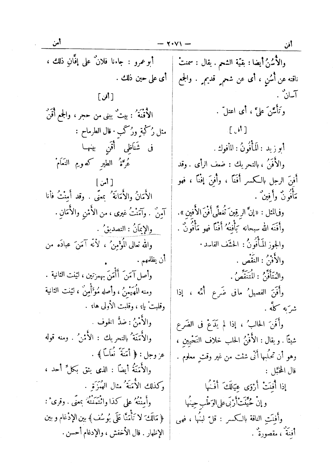 [أمن] الأَمانُ والأَمانَةُ بمعنىً. وقد أَمِنْتُ فأنا آمِنٌ. وآمَنْتُ غيري، من الامن والامان. والايمان: التصديق. والله تعالى المُؤْمِنُ، لأنّه آمَنَ عبادَه من أن يظلمهم. وأصل آمَنَ أَأْمَنَ بهمزتين، ليّنت الثانية. ومنه المهيمن، وأصله مؤأمن، لينت الثانية وقلبت ياء، وقلبت الاولى هاء. والأَمْنُ: ضدُّ الخوف. والأَمَنَةُ بالتحريك: الأَمْنُ. ومنه قوله عز وجل: (أمَنَةً نُعاساً) . والأَمَنَةُ أيضاً: الذي يثق بكلِّ أحد، وكذلك الأُمَنَةُ مثال الهمزة. وأَمِنْتُهُ على كذا وائْتَمَنْتُهُ بمعنىً. وقرئ: (مالَكَ لا تَأْمَنَّا عَلى يوسُف) بين الإدْغام وبين الإظهار. قال الاخفش، والادغام أحسن.