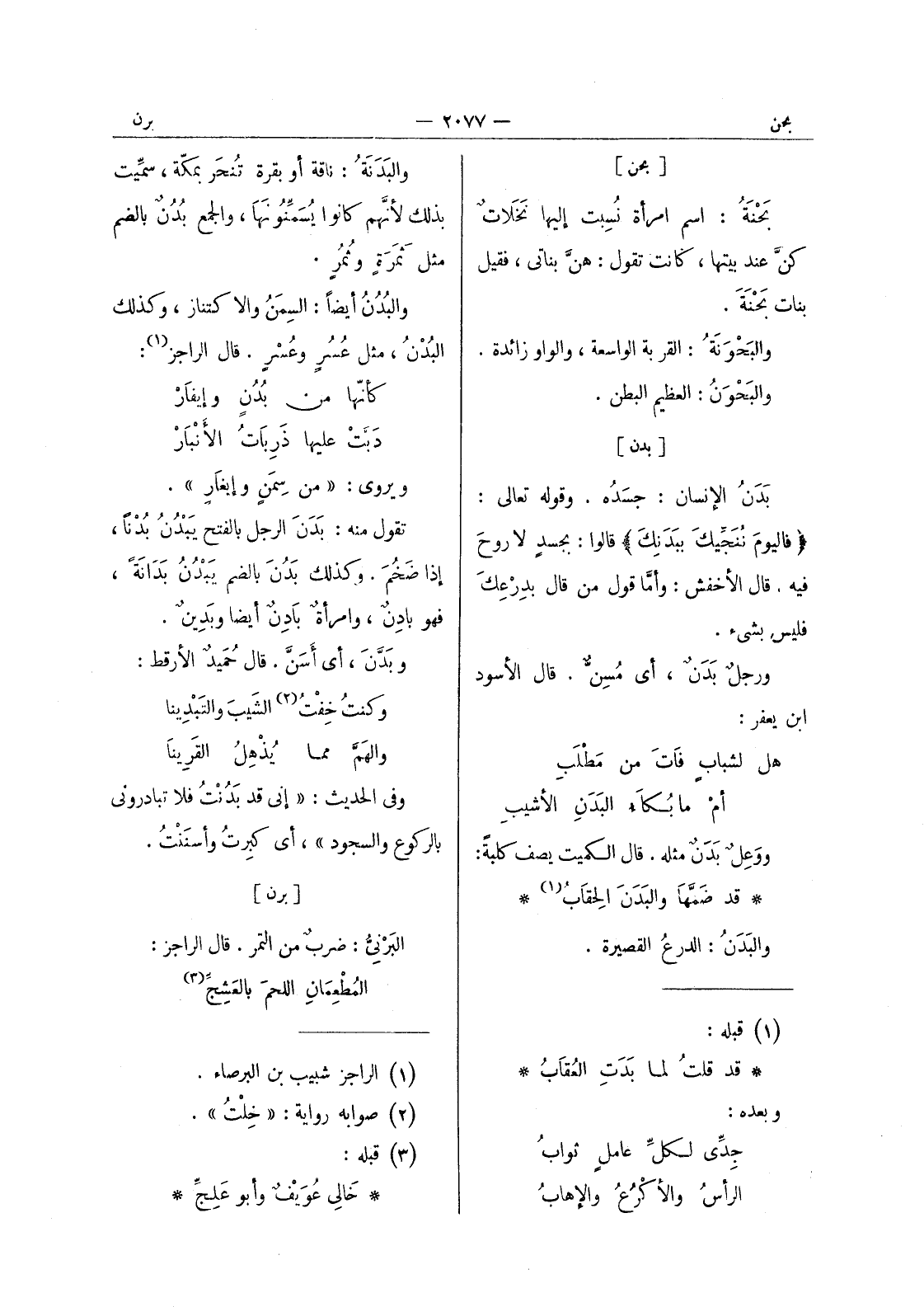 والبدنة: ناقة أو بقرة تُنحَر بمكة، سمِّيت بذلك لأنَّهم كانوا يُسَمِّنُونَها، والجمع بدن بالضم مثل ثمرة وثمر. والبدن أيضا: السمن والاكتناز، وكذلك البُدْنُ، مثل عُسُرٍ وعُسْرٍ. قال الراجز (¬1) : كأنها من بدن وإيفار دبت عليها ذربات الانبار ويروى: " من سمن وإيغار ". تقول منه: بَدَنَ الرجل بالفتح يَبْدُنُ بُدْناً، إذا ضَخُمَ. وكذلك بَدُنَ بالضم يَبْدُنُ بَدانَةً، فهو بادِنٌ، وامرأةٌ بادِنٌ أيضاً وبَدينٌ. وبَدَّنَ، أي أَسَنَّ. قال حُمَيدٌ الارقط: وكنت خفت (¬2) الشيب والتبدينا والهَمَّ مما يُذْهِلُ القَرينا وفي الحديث: " إني قد بَدُنْتُ فلا تبادروني بالركوع والسجود "، أي كبِرتُ وأسننت.