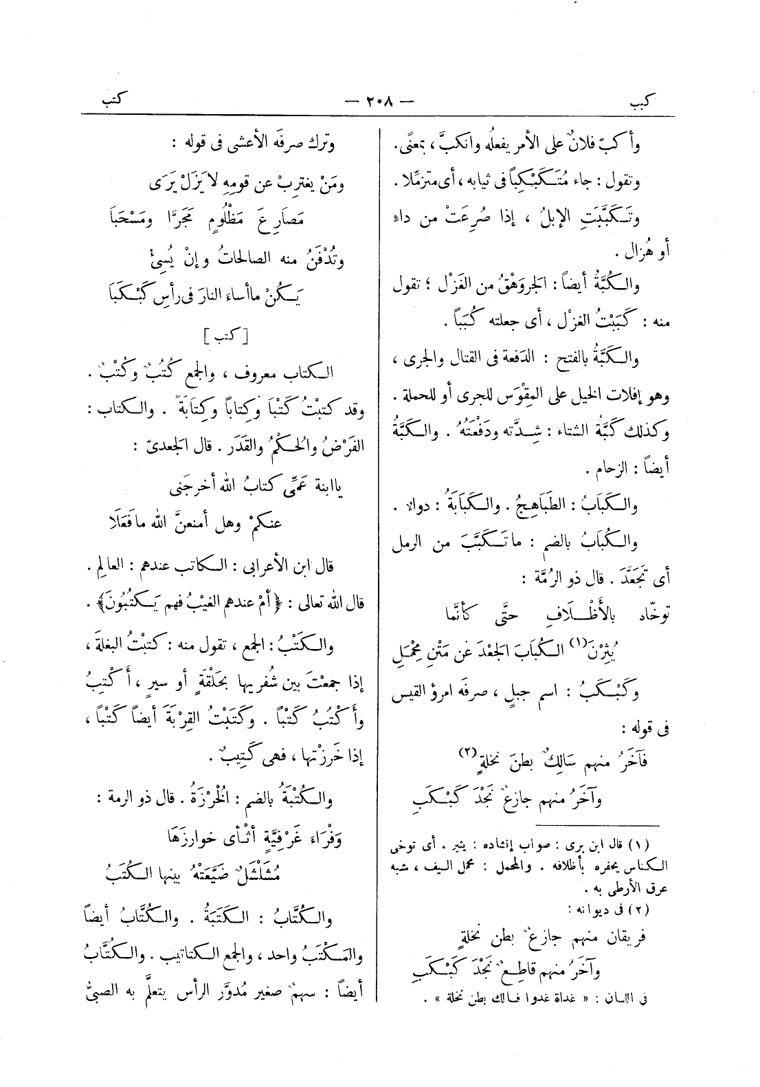 وأكب فلان على الامر يفعله وانكب، بمعنى. وتقول: جاء متكبكبا في ثيابه، أي متزملا. وتكببت الابل، إذا صُرِعت من داءٍ أو هُزال. والكُبَّةُ أيضاً: الجَروَهْقُ من الغَزْل، تقول منه: كَبَبْتُ الغزْل، أي جعلته كُبَباً. والكَبَّةُ بالفتح: الدَفعة في القتال والجري، وهو إفلات الخيل على المِقْوَس للجري أو للحملة. وكذلك كَبَّةُ الشتاء: شِدَّته ودَفْعَتُهُ. والكَبَّةُ أيضاً: الزحام. والكَبابُ: الطَباهِجُ. والكَبابَةُ: دواءٌ. والكُبابُ بالضم: ما تَكَبَّبَ من الرمل أي تجعَّدَ. قال ذو الرمّة: توخاه بالاظلاف حتى كأنما * يثرن (¬1) الكُبابَ الجَعْدَ عن مَتْنِ مِحْمَلِ وكبكب: اسم جبل، صرفه امرؤ القيس في قوله: فآخر منهم سالك بطن نَخْلةٍ (¬2) * وآخرُ منهم جازِعٌ نَجْدَ كبكب