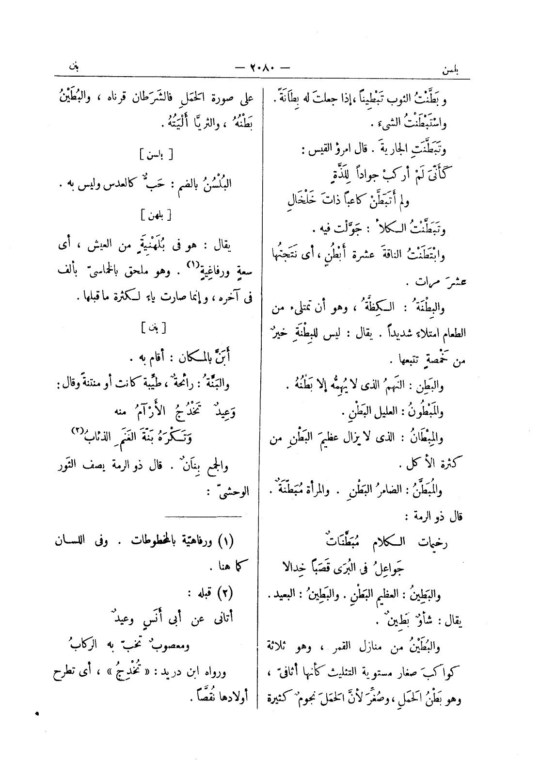 [بلهن] يقال: هو في بُلَهْنِيَةٍ من العيش، أي سعة ورفاغية (¬1) . وهو ملحق بالخماسى بألف في آخره، وإنما صارت ياء لكثرة ما قبلها.