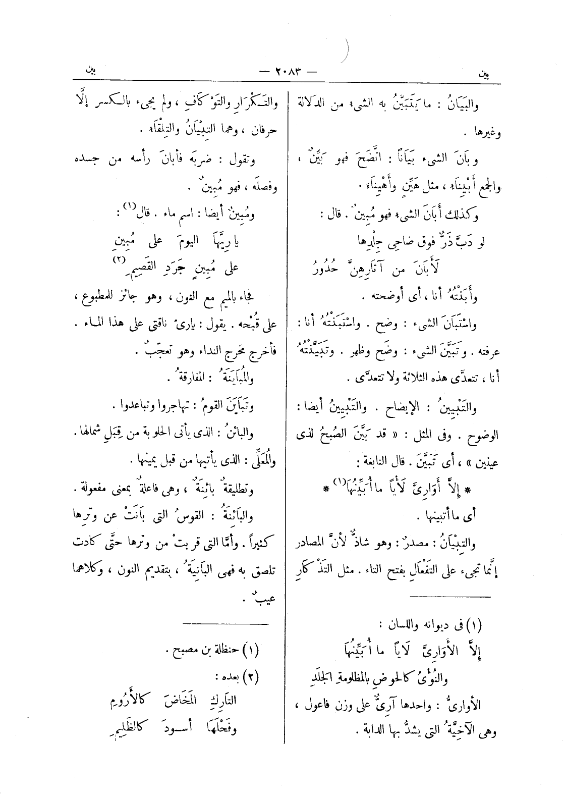 والبيان: ما يتبين به الشئ من الدلالة وغيرها. وبان الشئ بَياناً: اتَّضَحَ فهو بَيِّنٌ، والجمع أبيناء، مثل هين وأهيناء. وكذلك أبان الشئ فهو مُبينٌ. قال: لو دَبَّ ذَرٌّ فوق ضاحي جِلْدِها لأبانَ من آثارِهِنَّ حُدورُ وأَبَنْتُهُ أنا، أي أوضحته. واستبان الشئ: وضح. واستبنته أنا: عرفته. وتبين الشئ: وضح وظهر. وتَبَيَّنْتُهُ أنا، تتعدَّى هذه الثلاثة ولا تتعدَّى. والتَبْيينُ: الإيضاح. والتَبيِينُ أيضاً: الوضوح. وفي المثل: " قد بَيَّنَ الصُبحُ لذي عينين "، أي تبين. قال النابغة: