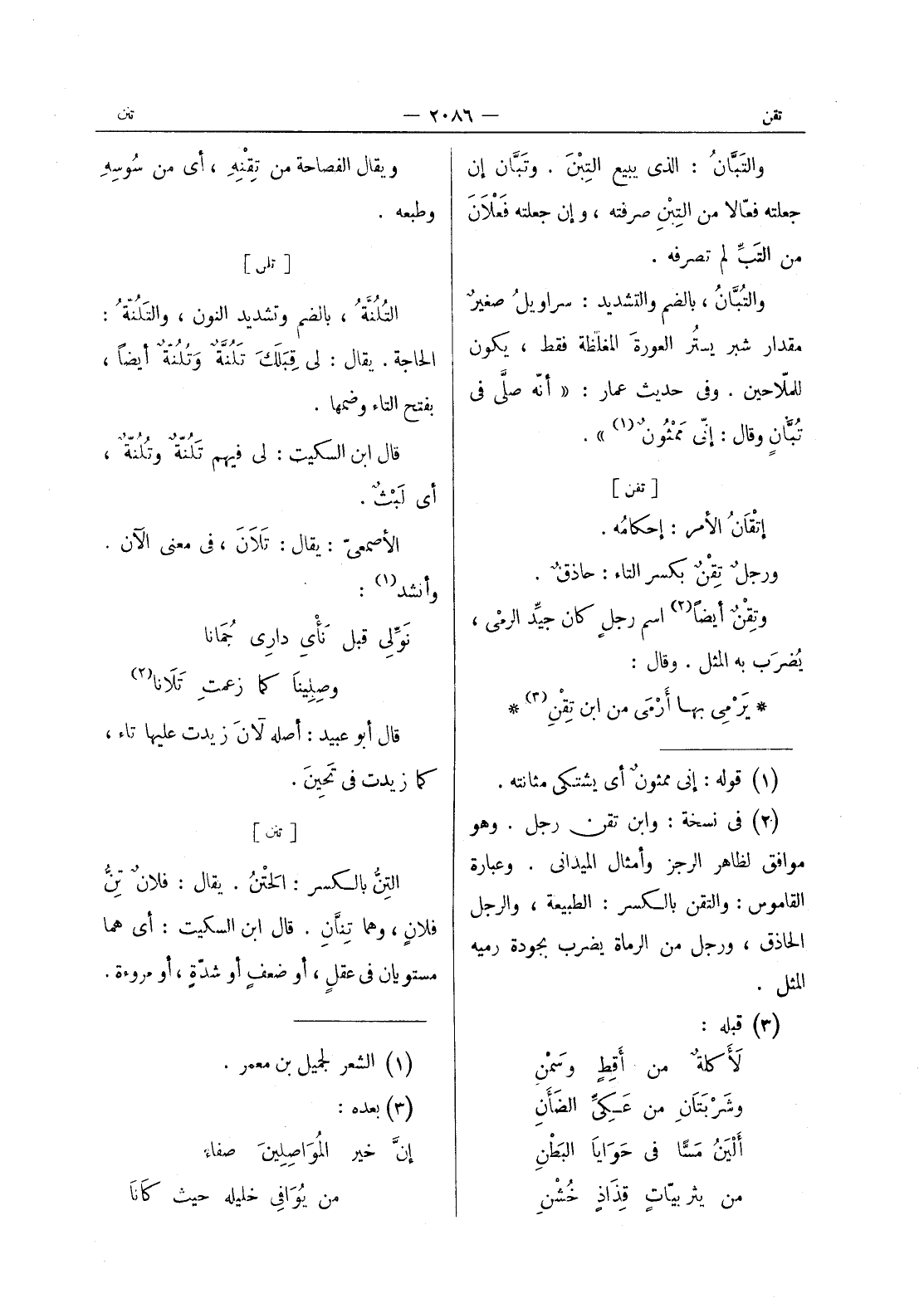 [تلن] التُلْنَةُ، بالضم وتشديد النون، والتَلُنَّةُ: الحاجة. يقال: لي قِبَلَكَ تلنة وتلنة أيضا، بفتح التاء وضمها. قال ابن السكيت: لى فيهم تَلُنّةٌ وتُلُنَّةٌ، أي لَبْثٌ. الأصمعيّ: يقال: تَلانَ، في معنى الآن. وأنشد (¬1) : نَوِّلي قبل نأي داري جُمانا وصِلينا كما زعمتِ تَلانا (¬2) قال أبو عبيد: أصله لان زيدت عليها تاء، كما زيدت في تحين.