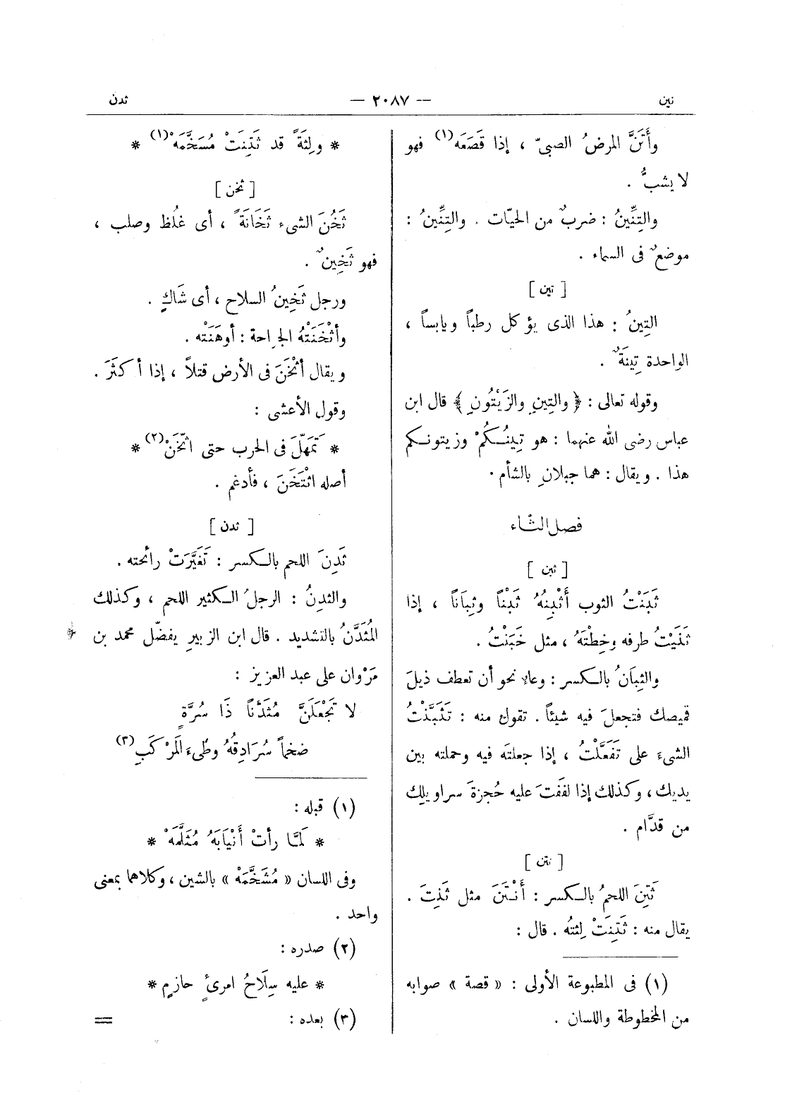 [ثدن] ثَدِنَ اللحم بالكسر: تَغَيَّرَتْ رائحته. والثدِنُ: الرجلُ الكثير اللحم، وكذلك المثدن بالتشديد. قال ابن الزبير يفضل محمد بن مروان على عبد العزيز: لا تجعلن مثدنا ذا سرة صخما سرادقه وطئ المركب (¬3)