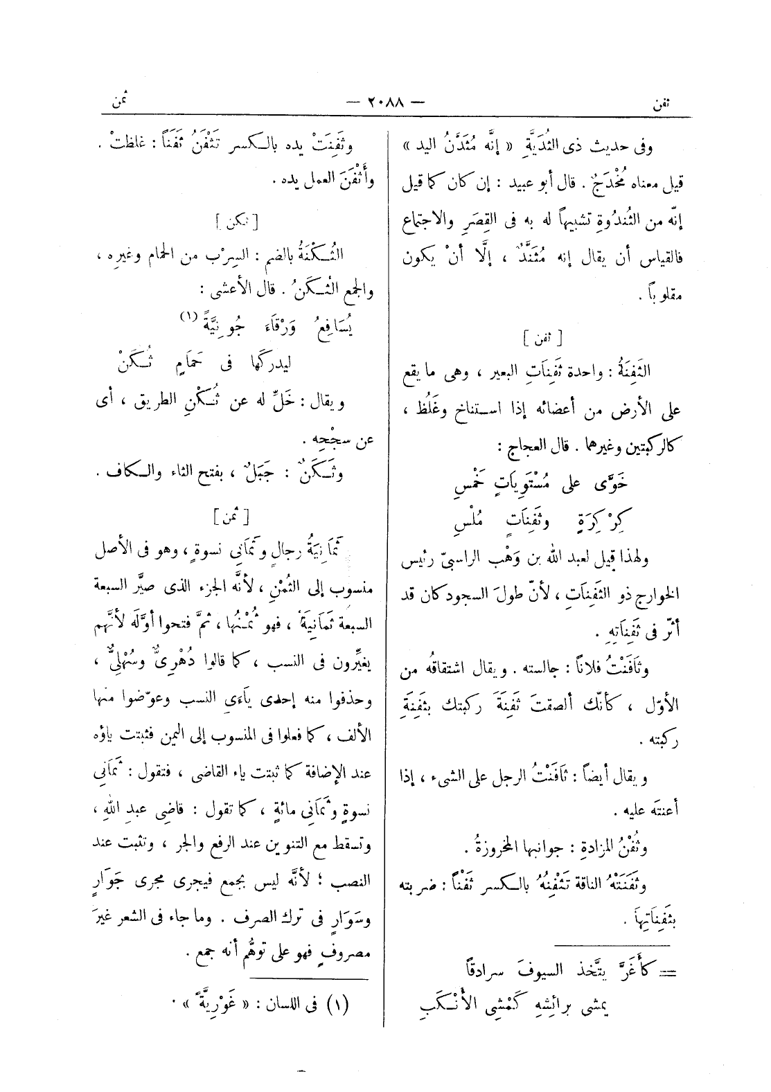 [ثمن] ثَمانِيَةُ رجالٍ وثَماني نسوةٍ، وهو في الأًصل منسوب إلى الثُمْنِ، لأنَّه الجزء الذي صيَّر السبعة السبعة ثمانية، فهو ثمنها، ثم فتحوا أوله لانهم يغيرون في النسب، كما قالوا دهري وسهلي، وحذفوا منه إحدى ياءى النسب وعوضوا منها الالف، كما فعلوا في المنسوب إلى اليمن فثبتت ياؤه عند الاضافة كما ثبتت ياء القاضى، فتقول: ثمانى نسوة وثماني مائة، كما تقول: قاضى عبد الله، وتسقط مع التنوين عند الرفع والجر، وتثبت عند النصب، لانه ليس بجمع فيجرى مجرى جوار وسوار في ترك الصرف. وما جاء في الشعر غير مصروف فهو على توهم أنه جمع.