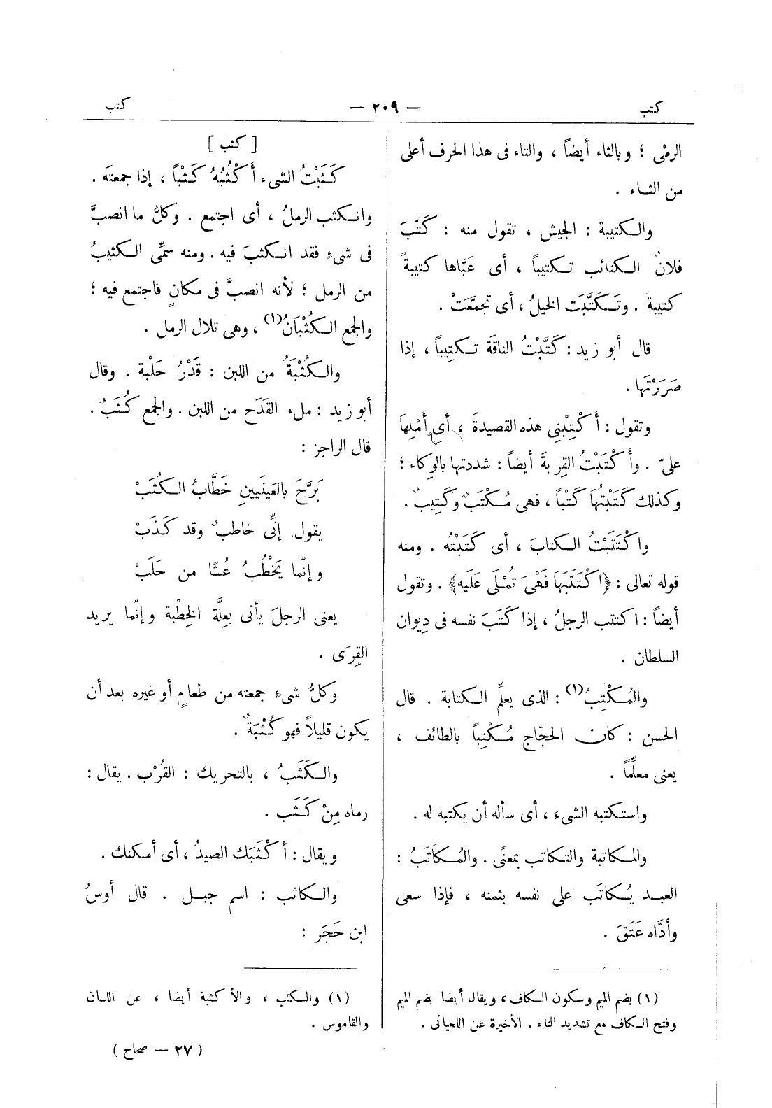 الرمى، وبالثاء أيضا، والتاء في هذا الحرف أعلى من الثاء. والكتيبة: الجيش، تقول منه: كَتَّبَ فلانٌ الكتائب تكتيباً، أي عبَّاها كتيبةً كتيبةً. وتَكَتَّبَت الخيلُ، أي تجمَّعت. قال أبو زيد: كَتَّبْتُ الناقة تكتيباً، إذا صَرَرْتَها. وتقول: أكْتِبْني هذه القصيدة، أي أملِها عليّ. وأ كتبت القربة أيضا: شددتها بالوكاء، وكذلك كَتَبْتُها كَتْباً، فهي مُكْتَبٌ وكَتيبٌ. واكْتَتَبْتُ الكتابَ، أي كَتَبْتُه. ومنه قوله تعالى: (اكْتَتَبَها فهيَ تُمْلى عَلَيه) . وتقول أيضاً: اكتتب الرجلُ، إذا كَتَبَ نفسه في ديوان السلطان. والمُكْتِبُ (¬1) : الذي يعلِّم الكتابة. قال الحسن: كان الحجَّاج مُكْتِباً بالطائف، يعني معلِّماً. واستكتبه الشئ، أي سأله أن يكتبه له. والمكاتبة والتكاتب بمعنًى. والمُكاتَبُ: العبد يُكاتَب على نفسه بثمنه، فإذا سعى وأداه عتق.
