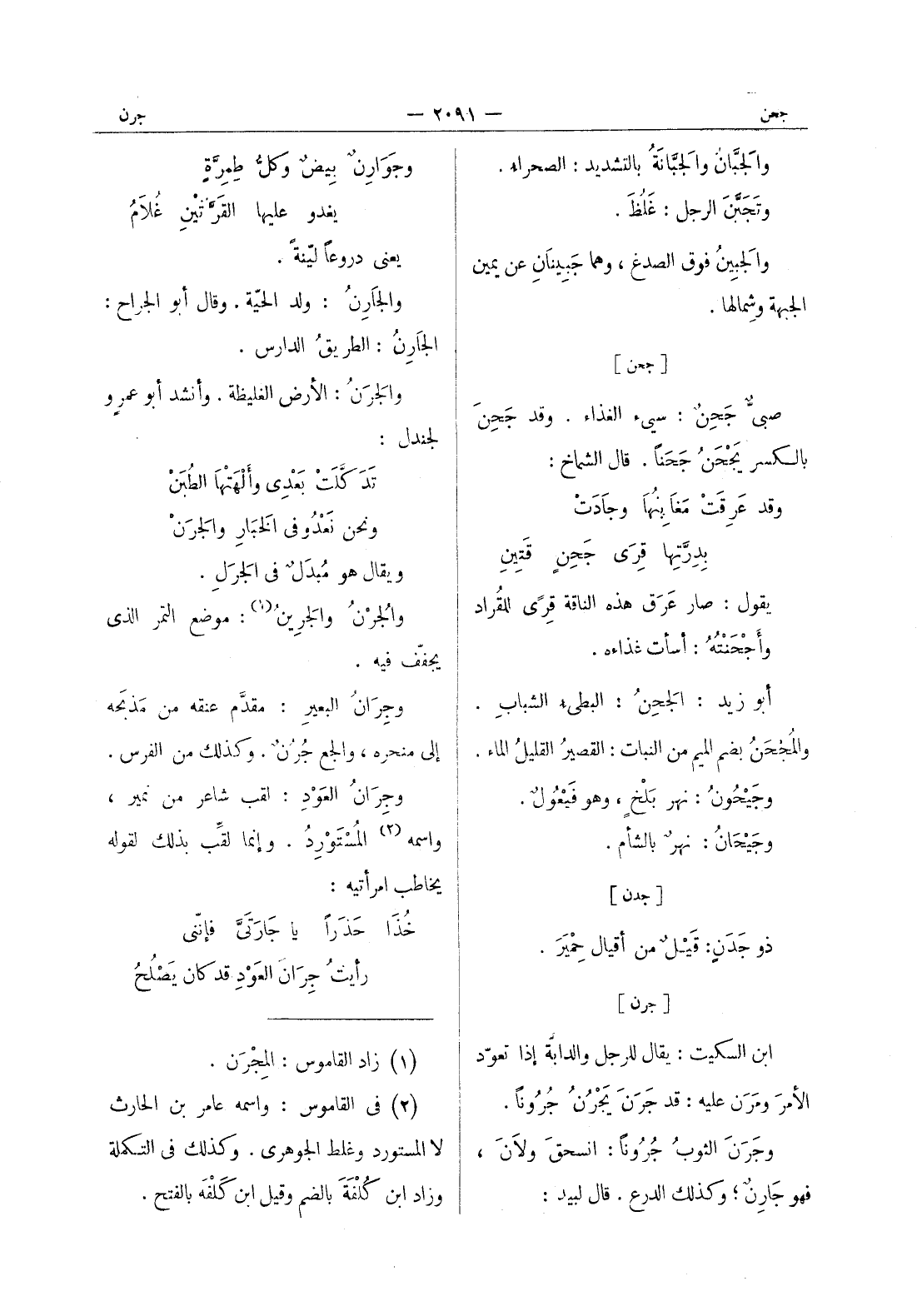 وجوارن بيض وكل طمرة يغدو عليها القَرَّتَيْنِ غَلامُ يعني دروعاً ليّنةً. والجارِنُ: ولد الحيّة. وقال أبو الجراح: الجارن: الطريق الدارس. والجرن: الارض الغليظة. وأنشد أبو عمرو لجندل: تدكلت بعدى وألهتها الطُبَنْ ونحن نعدو في الخَبارِ والجرن ويقال هو مبدل في الجرل. والجرن والجرين (¬1) : موضع التمر الذي يجفّف فيه. وجِرانُ البعيرِ: مقدّم عنقه من مَذبَحه إلى منحره، والجع جرن. وكذلك من الفرس. وجران العود: لقب شاعر من نمير، واسمه (¬2) المستورد. وإنما لقب بذلك لقوله يخاطب امرأتيه: خذا حذرا يا جارتي فإننى رأيت جران العود قد كان يصلح