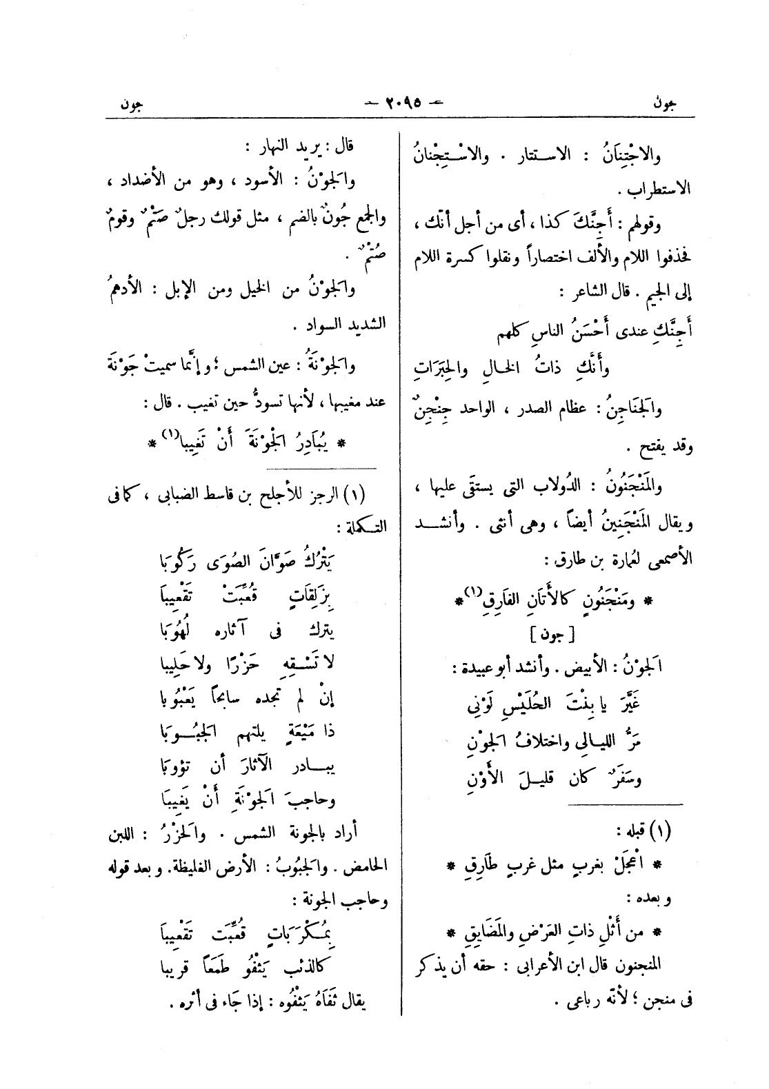 قال: يريد النهار: والجَوْنُ: الأسود، وهو من الأضداد، والجمع جونٌ بالضم، مثل قولك رجل صتم وقوم صتم. والجَوْنُ من الخيل ومن الإبل: الأدهمُ الشديد السواد. والجَوْنَةُ: عين الشمس، وإنَّما سميتْ جَوْنَة عند مغيبها، لأنها تسودُّ حين تغيب. قال:
