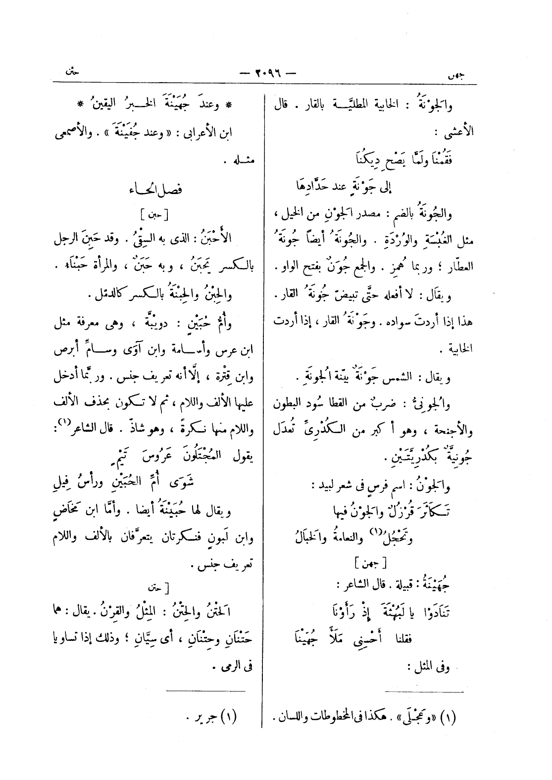 [جهن] جهينة: قبيلة. قال الشاعر: تنادوا يا لبهثة إذ رأونا فقلنا أحسنى ملا جهينا وفي المثل