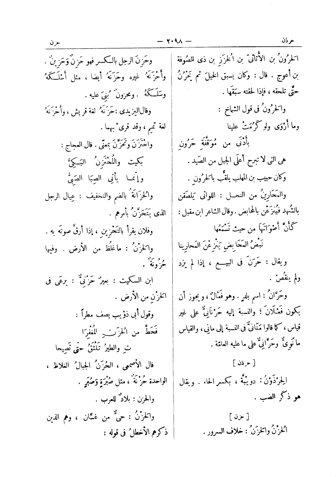 وحَزِنَ الرجل بالكسر فهو حَزِنٌ وَحَزينٌ. وأحَزْنَهُ غيره وحَزَنَهُ أيضاً، مثل أسلكه وسلكه. ومحزونٌ بُنيَ عليه. وقال اليزيدي: حَزَنَهُ لغة قريش، وأَحْزَنَهُ لغة تميم، وقد قرئ بهما. واحتزن وتحزن بمعنى. قال العجاج: بكيت والمحتزن البكى وإنما يأتي الصبا الصبى والحزانة بالضم والتخفيف: عِيال الرجل الذي يتحزن بأمرهم. وفلان يقرأ بالتحزين، إذا أرقّ صوتَه به. والحَزْنُ: ما غلُظَ من الأرض. وفيها حزونة. ابن السكيت: بعير حزنى: يرعى في الحزن من الارض. وقول أبى ذؤيب يصف مطرا: فحط من الحزن المغفرا ت والطير تلثق حتى تصيحا قال الاصمعي، الحزن الجبال الغلاظ، الواحدة حزنة، مثل صبرة وصبر. والحزن: بلاد للعرب. والحزن: حى من غسان، وهم الذين ذكرهم الاخطل في قوله: