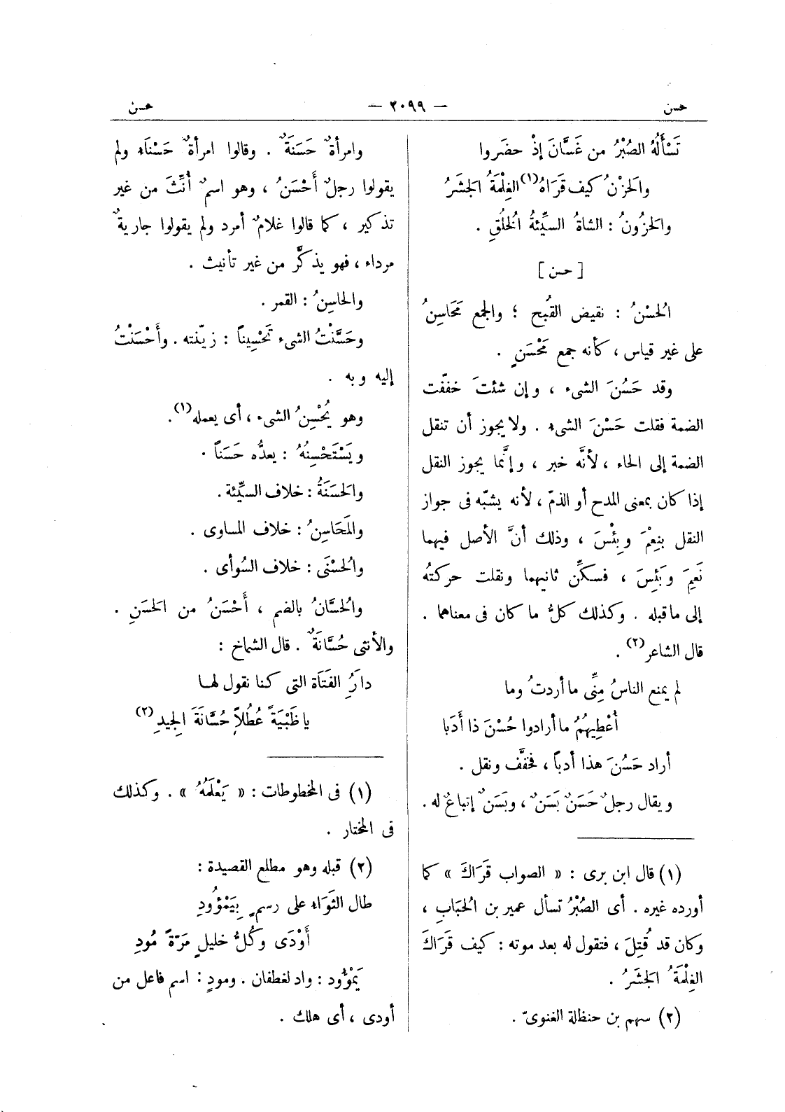 وامرأة حَسَنَةٌ. وقالوا امرأةٌ حَسْناءُ ولم يقولوا رجل أحسن، وهو اسم أنث من غير تذكير، كما قالوا غلام أمرد ولم يقولوا جارية مرداء، فهو يذكر من غير تأنيث. والحاسن: القمر. وحسنت الشئ تحسينا: زينته. وأحسنت إليه وبه. وهو يحسن الشئ، أي يعمله (¬1) . ويَسْتَحْسِنُهُ: يعدُّه حَسَناً. والحَسَنَةُ: خلاف السيِّئة. والمَحاسِنُ: خلاف المساوى. والحسنى: خلاف السوأى. والحسان بالضم، أَحْسَنُ من الحَسَنِ. والأنثى حُسَّانَةٌ. قال الشماخ: دارُ الفَتاة التي كنا نقول لها يا ظبية عطلا حسانة الجيد (¬2)