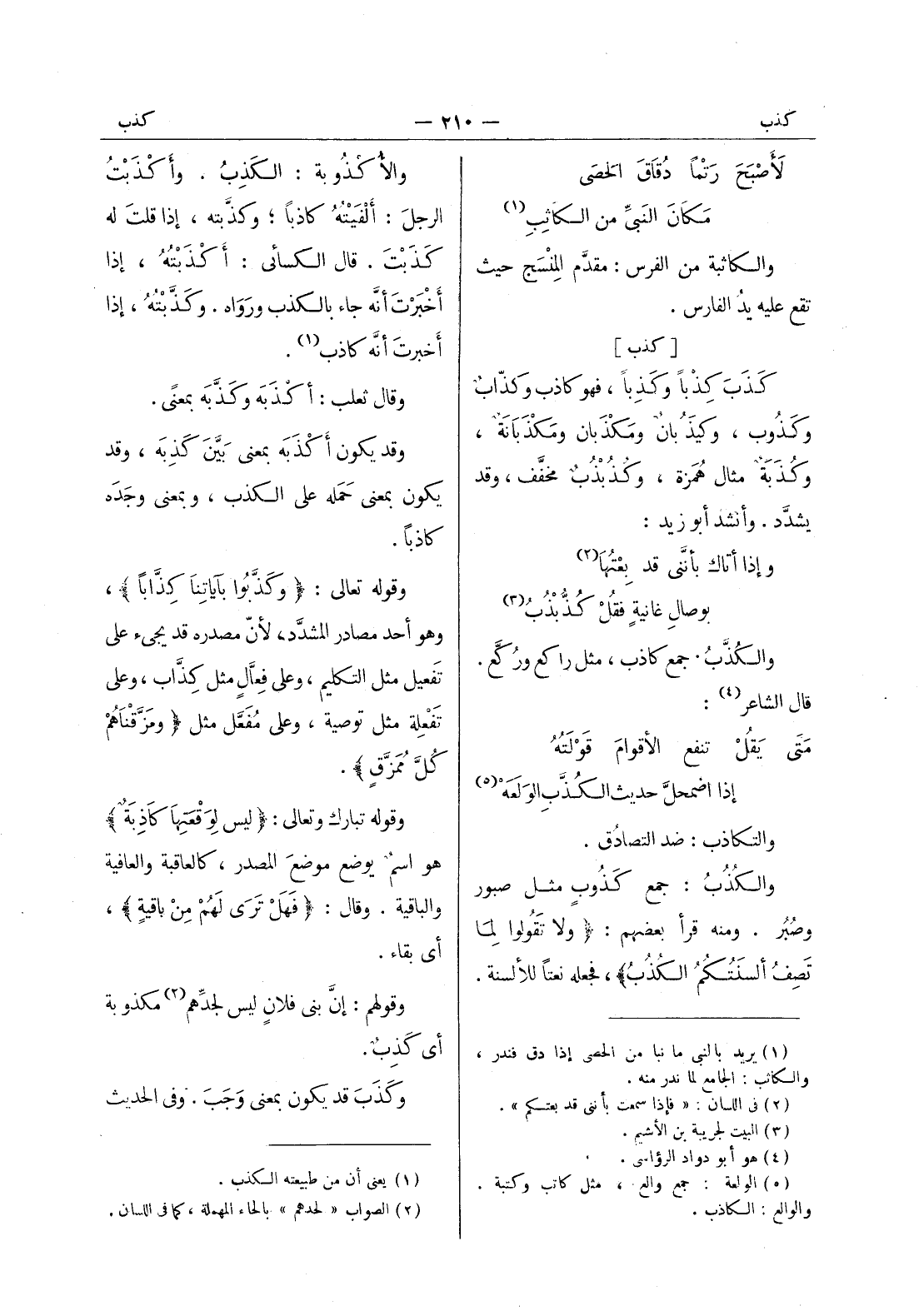 والاكذوبة: الكذب. وأكذبت الرجلَ: ألفَيْتُه كاذباً: وكذَّبته، إذا قلتَ له كَذَبْتَ. قال الكسائي: أكْذَبْتُهُ، إذا أخْبَرْتَ أنه جاء بالكذب ورواه. وكَذَّبْتُهُ، إذا أخبرتَ أنه كاذب (¬1) . وقال ثعلب: أكْذَبَهُ وكَذَّبَه بمعنى. وقد يكون أكْذَبَهُ بمعنى بَيَّنَ كَذِبَه، وقد يكون بمعنى حَمَله على الكذب، وبمعنى وجَدَه كاذباً. وقوله تعالى: (وكَذَّبوا بآياتنا كِذَّاباً) ، وهو أحد مصادر المشدد، لان مصدره قد يجئ على تفعيل مثل التكليم، وعلى فعال مثل كذاب، وعلى تفعلة مثل توصية، وعلى مفعل مثل (ومزقناهم كل ممزق) . وقوله تبارك وتعالى: (ليس لِوَقْعَتها كاذِبَةٌ) هو اسمٌ يوضع موضع المصدر، كالعاقبة والعافية والباقية. وقال: (فهل تَرى لهمْ من باقِيَة) ، أي بقاء. وقولهم: إن بنى فلان ليس لجدهم (¬2) مكذوبة أي كَذِبٌ. وكَذَبَ قد يكون بمعنى وجب. وفى الحديث