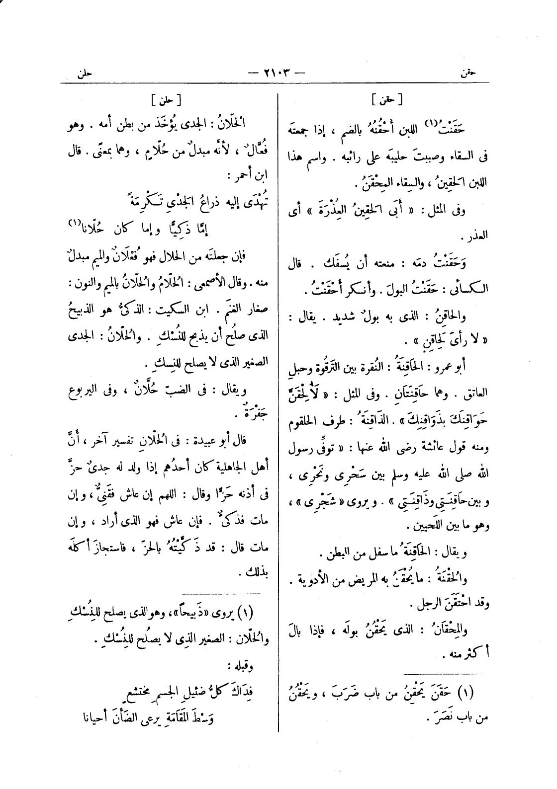 [حقن] حَقَنْتُ (¬1) اللبن أَحْقُنُهُ بالضم، إذا جمعتَه في السقاء وصببتَ حليبَه على رائبه. واسم هذا اللبن الحَقينُ، والسِقاء المِحْقَنُ. وفي المثل: " أبى الحَقينُ العُِذْرَةَ " أي العذر. وَحَقَنْتُ دمَه: منعته أن يُسفَك. قال الكسائي: حَقَنْتُ البولَ. وأنكر أَحْقَنْتُ. والحاقِنُ: الذي به بولٌ شديد. يقال: " لا رأيَ لِحاقِنٍ ". أبو عمرو: الحاقِنَةُ: النُقرة بين التَرقوة وحبلِ العاتق. وهما حاقنتان. وفي المثل: " لالحقن حواقنك بذواقنك ". الذاقنة: طرف الحلقوم ومنه قول عائشة رضى الله عنها: " توفى رسول الله صلى الله عليه وسلم بين سحري ونحرى، وبين حاقنتى وذاقنتى ". ويروى " شجري "، وهو ما بين اللحيين. ويقال: الحاقنة ما سفل من البطن. والحُقْنَةُ: ما يُحْقَنُ به المريض من الأدوية. وقد احْتَقَنَ الرجل. والمِحْقانُ: الذي يَحْقُنُ بولَه، فإذا بالَ أكثر منه.