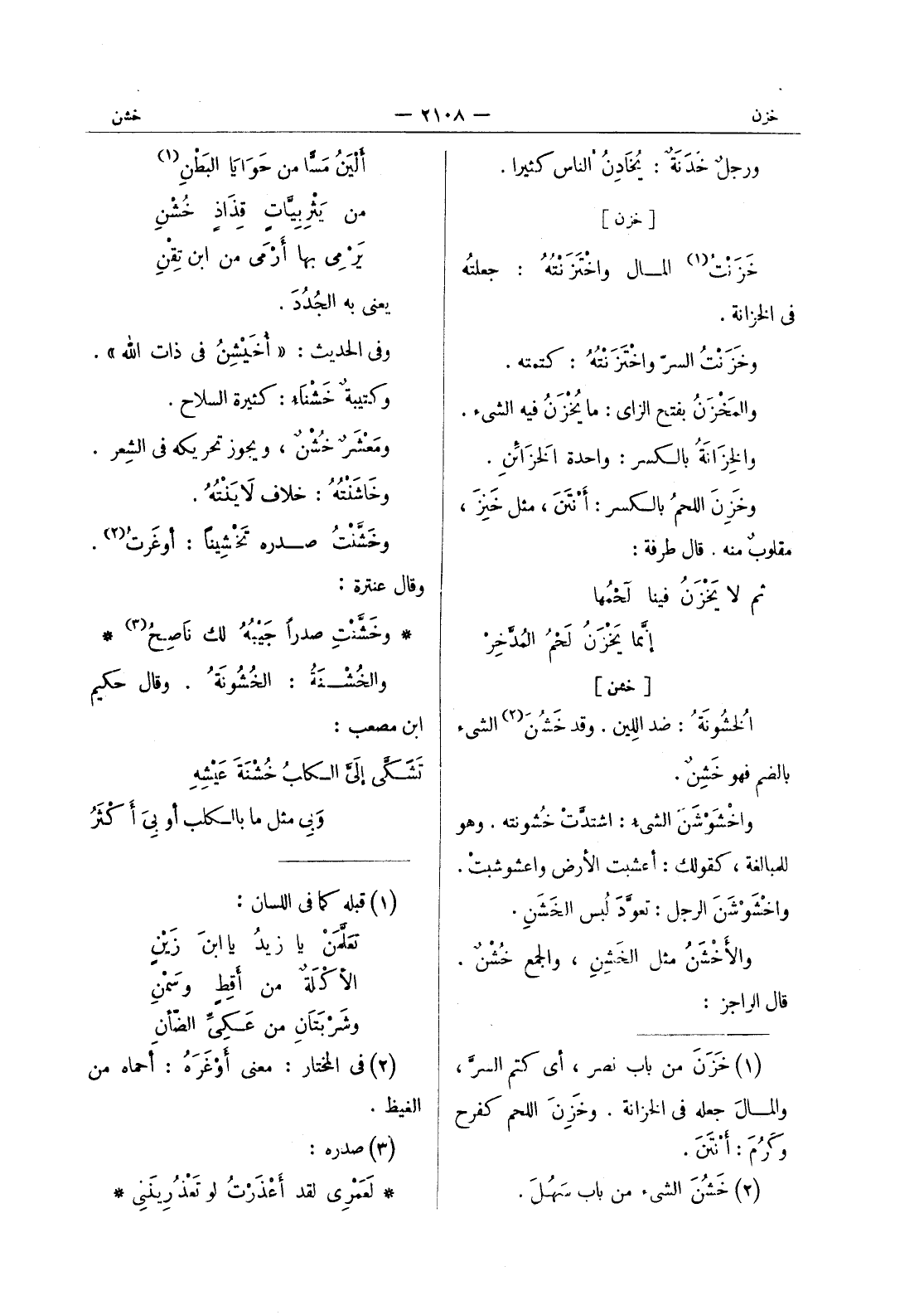 [خزن] خَزَنْتُ (¬1) المال واخْتَزَنْتُهُ: جعلته في الخزانة. وخَزَنْتُ السرّ واخْتَزَنْتُهُ: كتمته. والمَخْزَنُ بفتح الزاي: ما يخزن فيه الشئ. والخزانة بالكسر: واحدة الخَزائِنِ. وخَزِنَ اللحمُ بالكسر: أَنْتَنَ، مثل خَنِزَ، مقلوبٌ منه. قال طرفة: ثم لا يَخْزَنُ فينا لَحْمُها إنَّما يَخْزَنُ لَحْمُ المدخر