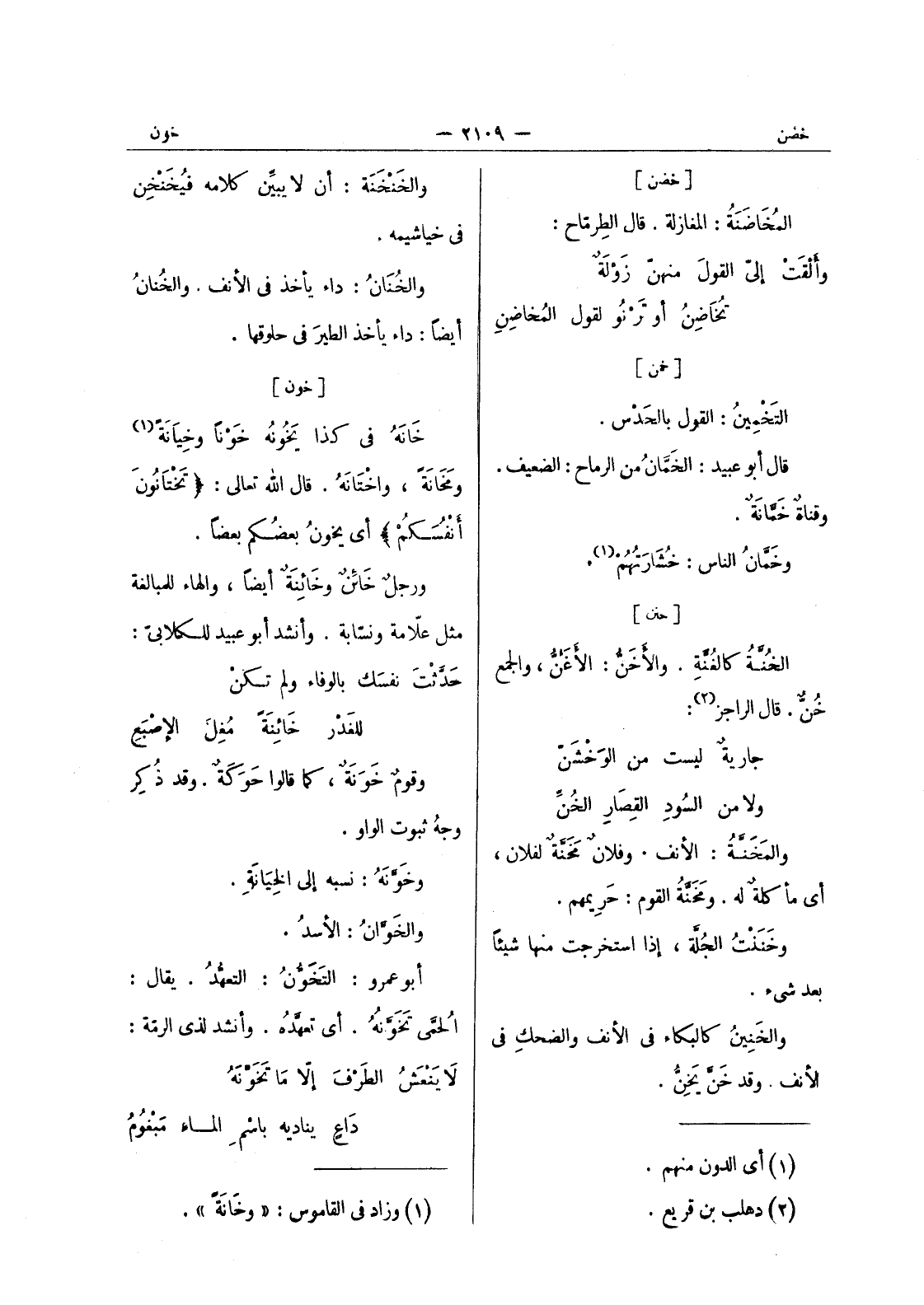 [خون] خانَهُ في كذا يَخونُه خَوْناً وخِيانَةً (¬1) ومَخانَةً، واخْتانَهُ. قال الله تعالى: (تَخْتانونَ أَنْفُسَكُمْ) أي يخونُ بعضُكم بعضاً. ورجلٌ خائِنٌ وخائِنَةٌ أيضاً، والهاء للمبالغة مثل علاّمة ونسّابة. وأنشد أبو عبيد للكلابى: حدثت نفسك بالوفاء ولم تكن للغَدْر خائِنَةً مُغِلَ الإصْبَعٍ وقومٌ خونة، كما قالوا حوكة. وقد ذكر وجه ثبوت الواو. وخونه: نسبه إلى الخِيانَة. والخَوَّانُ: الأسدُ. أبو عمرو: التَخَوُّنُ: التعهُّدُ. يقال: الحُمَّى تَخَوَّنُهُ. أي تعهَّدُه. وأنشد لذي الرمّة: لا يَنْعَشُ الطَرْفَ إلا ما تَخَوَّنَهُ داعٍ يناديه باسم الماء مبغوم