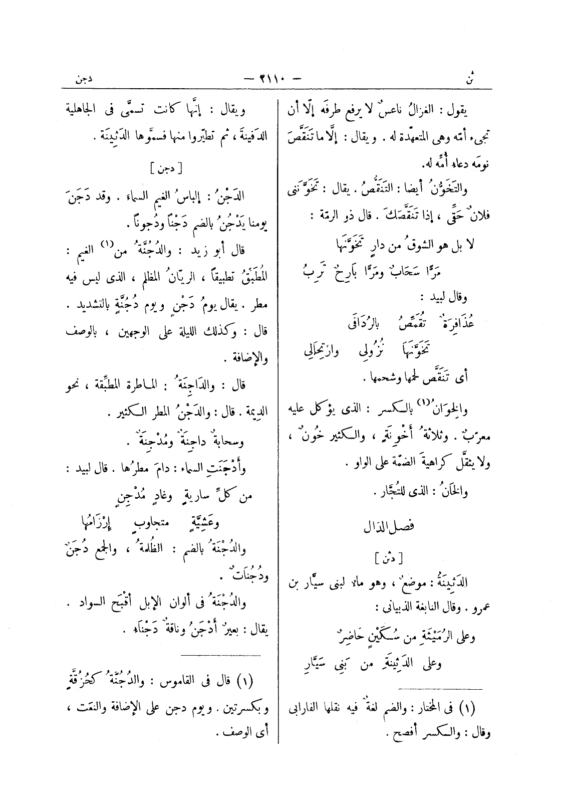 [دجن] الدَجْنُ: إلباسُ الغيم السماءَ. وقد دجنَ يومنا يَدْجُنُ بالضم دَجْناً ودُجوناً. قال أبو زيد: والدُجُنَّةُ من (¬1) الغيم: المُطَبِّقُ تطبيقاً، الريّانُ المظلم، الذي ليس فيه مطر. يقال يومُ دَجْنٍ ويوم دجنة بالتشديد. قال: وكذلك الليلة على الوجهين، بالوصف والاضافة. قال: والداجنة: الماطرة المطبِّقة، نحو الديمة. قال: والدَجْنُ المطر الكثير. وسحابةٌ داجنَةٌ ومُدْجِنَةٌ. وأَدْجَنَتِ السماءُ: دامَ مطرُها. قال لبيد: من كلِّ ساريةٍ وغادٍ مدجن وعشية متجاوب إرزامها والدجنة بالضم: الظُلمةُ، والجمع دُجَنٌ ودُجُناتٌ. والدُجْنَةُ في ألوان الإبل أقْبَح السواد. يقال: بعيرٌ أَدْجَنُ وناقةٌ دجناء.