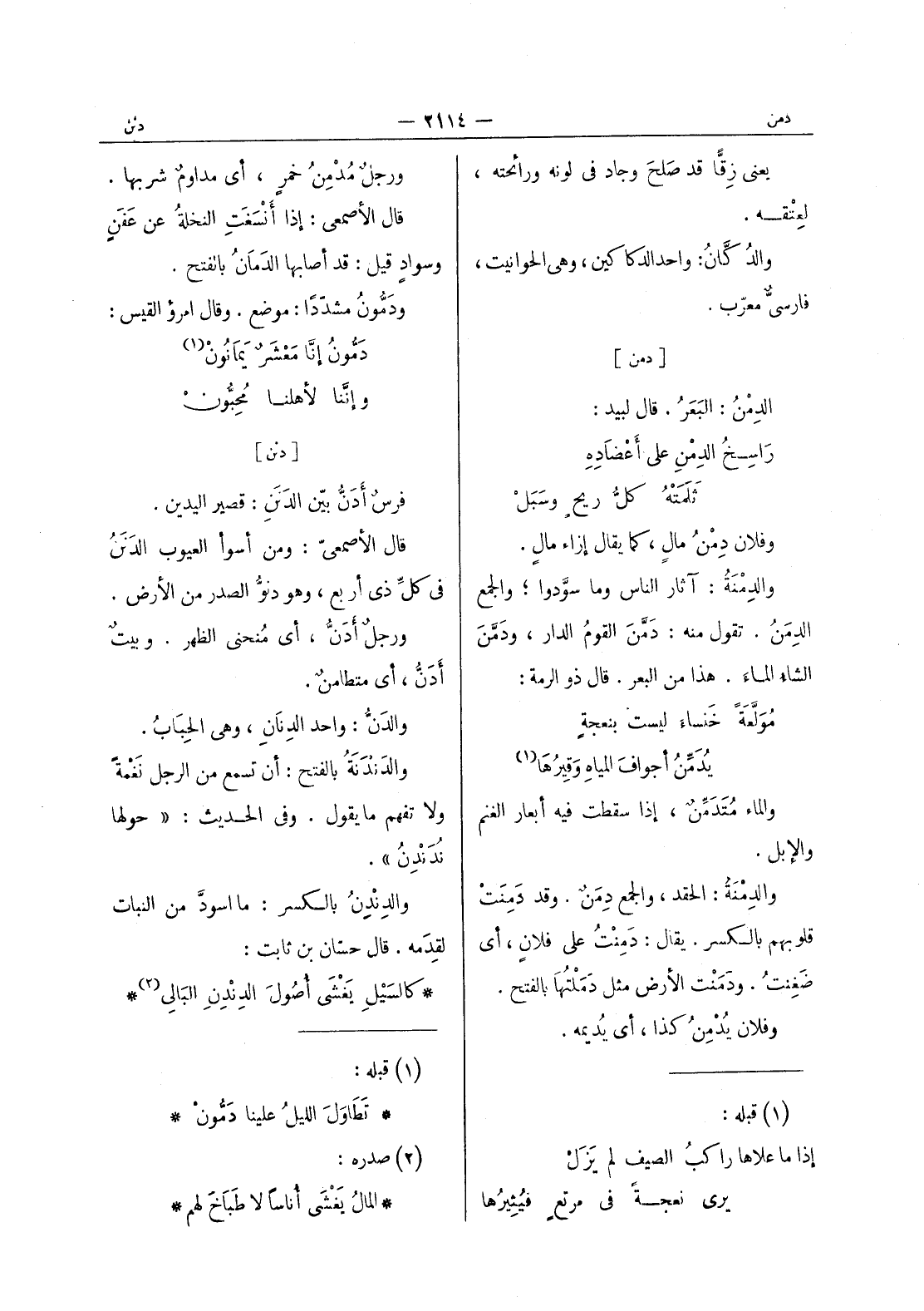 يعنى زقا قد صَلَحَ وجاد في لونه ورائحته، لعِتْقه. والدُكَّانُ: واحد الدكاكين، وهى الحوانيت، فارسي معرب. [دمن الدِمْنُ: البَعَرُ. قال لبيد: راسِخُ الدِمْنِ على أَعْضادِهِ ثَلَمَتْهُ كلُّ ريحٍ وسَبَلْ وفلان دِمْنُ مالٍ، كما يقال إزاء مالٍ. والدمْنَةُ: آثار الناس وما سوَّدوا، والجمع الدِمَنُ. تقول منه: دَمَّنَ القومُ الدار، ودَمَّنَ الشاءُ الماءَ. هذا من البعر. قال ذو الرمة: مُوَلَّعَةً خَنساَء ليست بنعجةٍ يُدَمِّنُ أجوافَ المياهِ وَقيرُها (¬1) والماءُ متدمن، إذا سقطت فيه أبعار الغنم والإبل. والدِمْنَةُ: الحقد، والجمع دِمَنٌ. وقد دَمِنَتْ قلوبهم بالكسر. يقال: دَمِنْتُ على فلانٍ، أي ضَغِنْتُ. ودَمَنْت الأرض مثل دَمَلْتُها بالفتح. وفلان يُدْمِنُ كذا، أي يديمه.