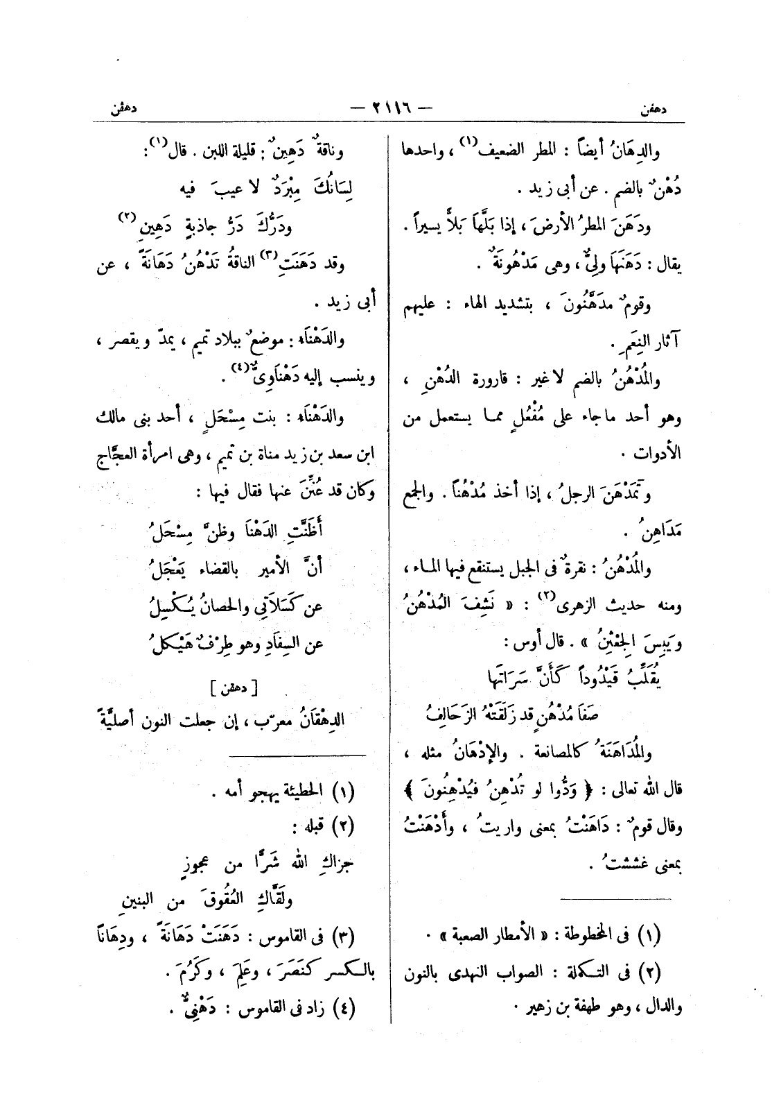 وناقة دهين: قليلة اللبن. قال (¬1) : لِسانُكَ مِبْرَدٌ لا عيبَ فيه ودَرُّكَ دَرُّ جاذبةٍ دَهينِ (¬2) وقد دَهَنَتِ (¬3) الناقةُ تَدْهُنُ دهانة، عن أبى زيد. والدهناء: موضع ببلاد تميم، يمد ويقصر، وينسب إليه دهناوى (¬4) . والدهناء: بنت مسحل، أحد بنى مالك ابن سعد بن زيد مناة بن تميم، وهى امرأة العجاج وكان قد عنن عنها فقال فيها: أظنت الدهنا وظن مسحل أن الامير بالقضاء يعجل عن كسلاتى والحصان يكسل عن السفاد وهو طرف هيكل