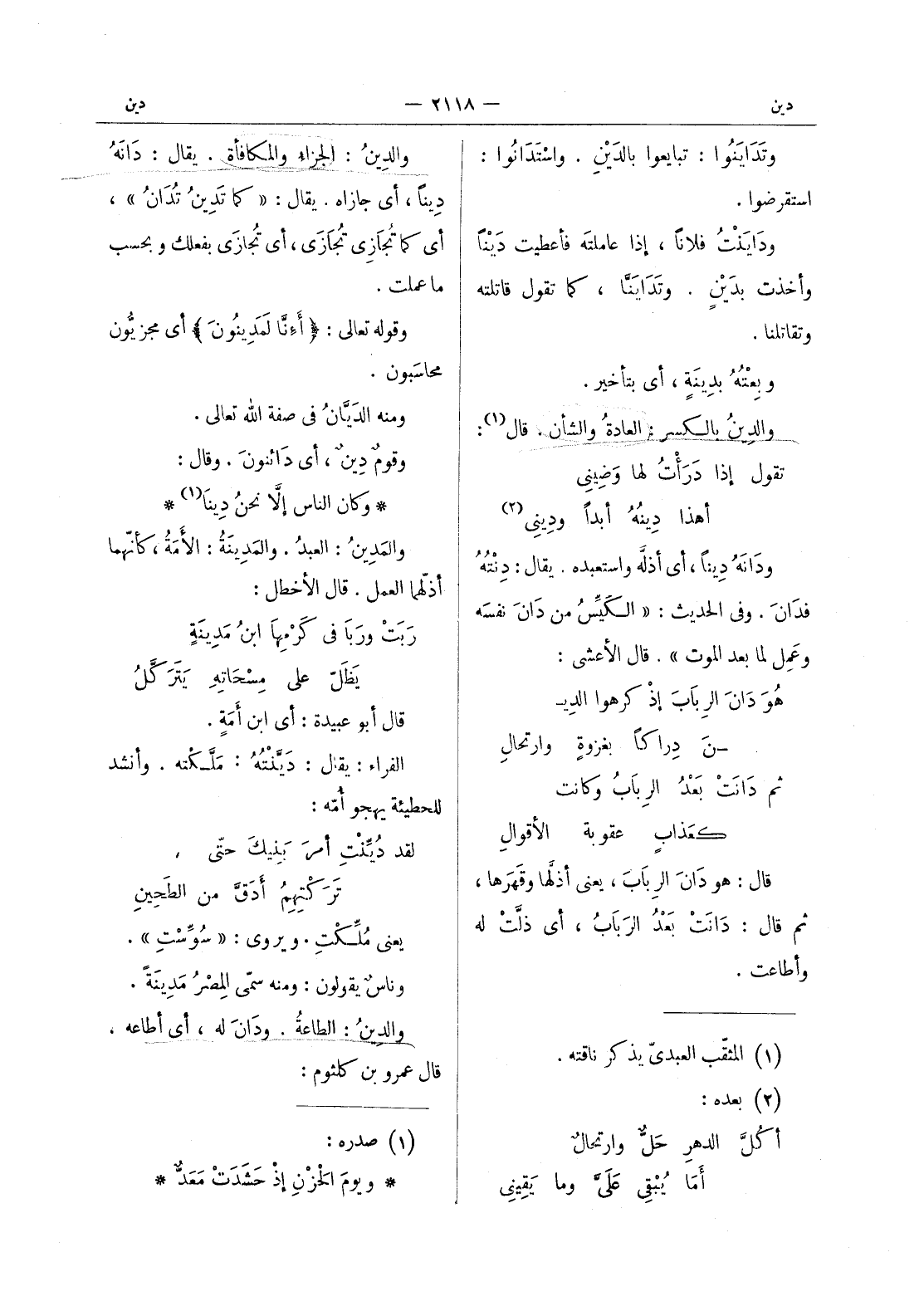 وتداينوا: تبايعوا بالدين. واستدانوا: استقرضوا. ودايَنْتُ فلاناً، إذا عامَلتَه فأعطيت دَيْناً وأخذت بدَيْنٍ. وتَدايَنَّا، كما تقول قاتلته وتقاتلنا. وبِعْتُهُ بدِينَةٍ، أي بتأخير. والدينُ بالكسر: العادة والشأن. قال (¬1) : تقول إذا درأت لها وَضيني أهذا دينُهُ أبداً وديني (¬2) ودانه دينا، أي أذلًّه واستعبده. يقال: دِنْتُهُ فدانَ. وفي الحديث: " الكَيِّسُ من دانَ نفسَه وعَمِل لما بعد الموت ". قال الاعشى: هو دان الرباب إذ كرهوا الدين دراكا بغزوة وارتحال ثم دانت بعد الرباب وكانت كعذاب عقوبة الاقوال قال: هو دان الرباب، يعنى أذلها وقهرها، ثم قال: دانت بعد الرباب، أي ذلت له وأطاعت.