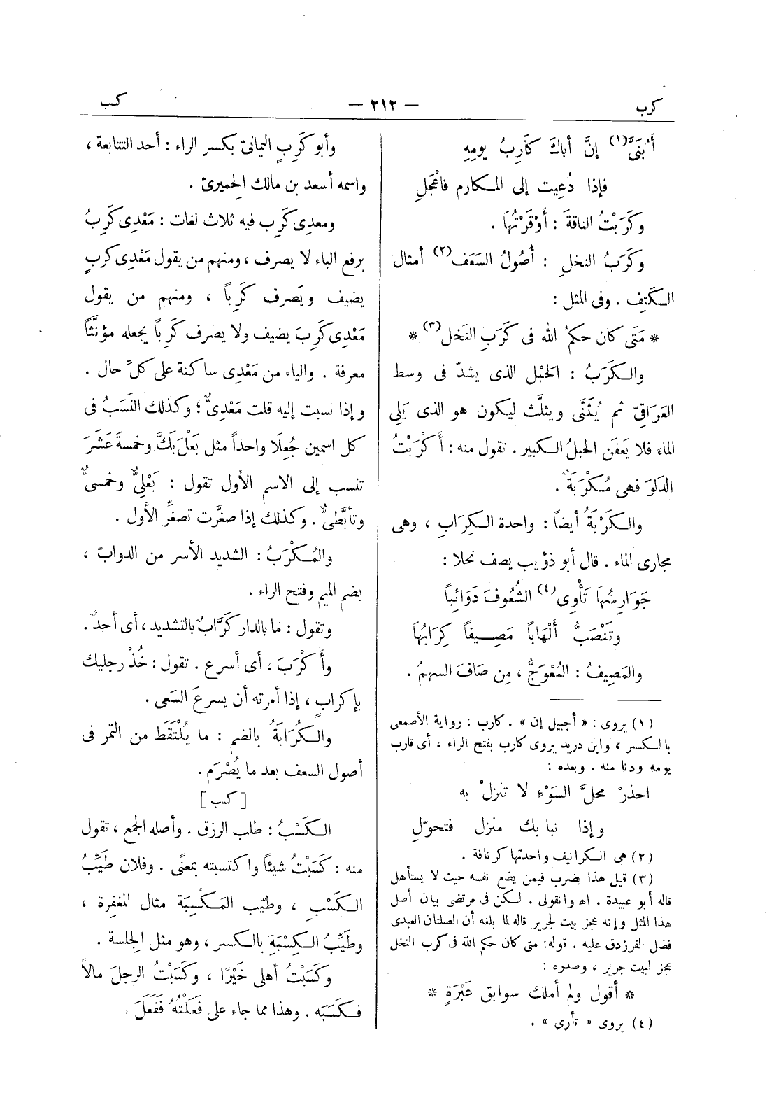 متى كان حكم الله في كَرَبِ النخل (¬3) * والكَرَبُ: الحبل الذي يشدّ في وسط العَراقيّ ثمَّ يُثَنَّى ويثلَّث ليكون هو الذي يلي الماءَ فلا يعفن الحبل الكبير. تقول منه: أكْرَبْتُ الدَلْوَ فهي مُكْرَبَةٌ. والكَرْبَةُ أيضاً: واحدة الكراب، وهى مجارى الماء. قال أبو ذؤيب يصف نحلا: جوارسها تأوى (¬4) الشعوف دوائبا * وتنصب ألهابا مصيفا كرابها والمصيف: المعوج، من صاف السهم.