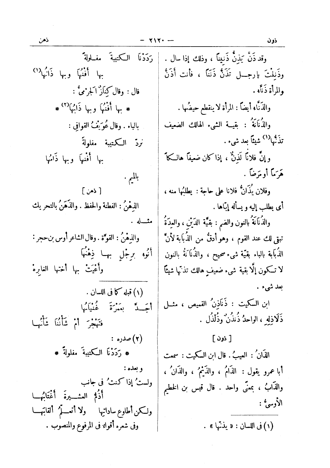 وقد ذَنَّ يَذِنُّ ذَنيناً، وذلك إذا سال. وذَنِنْتَ يا رجل تَذَنُّ ذَنَناً، فأنت أَذَنُّ والمرأة ذَنَّاءُ. والذَنَّاءُ أيضاً: المرأة لا ينقطع حيضها. والذنانة: بقية الشئ الهالك الضعيف تذنها (¬1) شيئا بعد شئ. وإنَّ فلاناً لَذِنٌّ، إذا كان ضعيفاً هالكاً هَرَماً أو مَرضاً. وفلان يُذانُّ فلاناً على حاجة: يطلُبها منه، أي يطلب إليه ويسأله إيّاها. والذُنانَةُ بالنون والضم: بقيَّة الدَيْنِ، والعِدَةُ تبقى لك عند القوم، وهو أدقُّ من الذُبابة لأنَّ الذُبابة بالباء بقيّة شئ صحيح، والذنانة بالنون لا تكون إلا بقية شئ ضعيف هالك تذنها شيئا بعد شئ. ابن السكيت: ذناذن القميص، مثل ذَلاذِلِهِ، الواحدُ ذُنْذُنٌ وذُلْذُل.