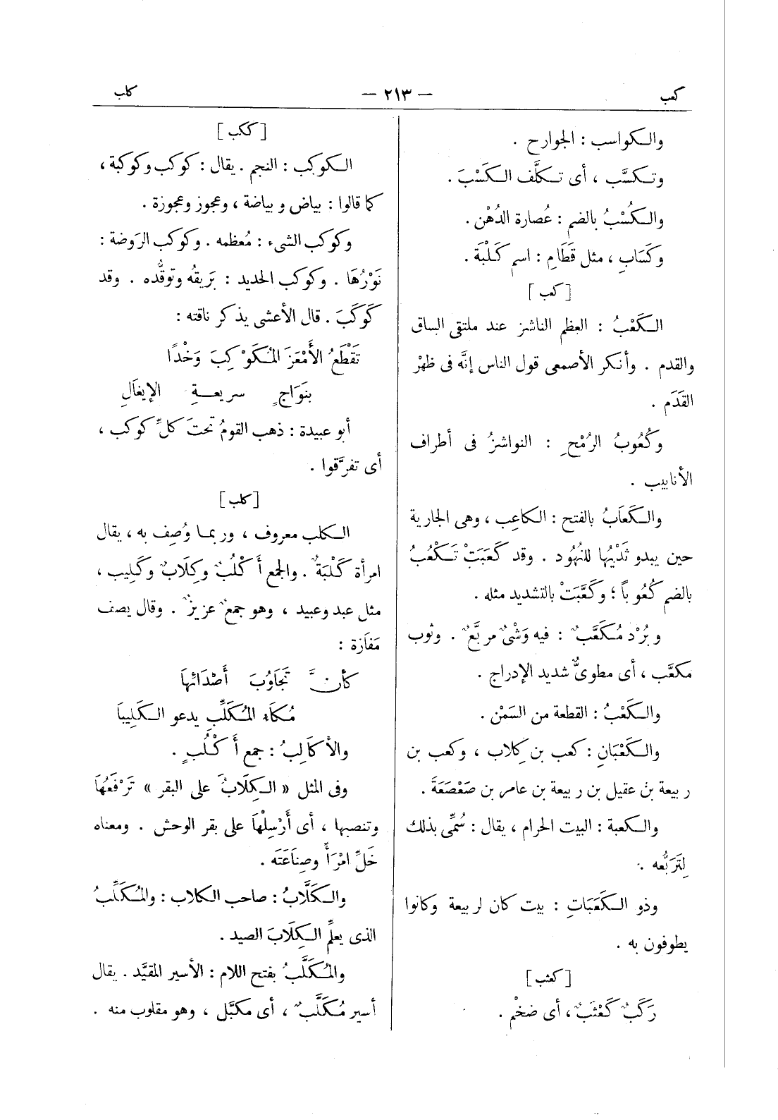 [ككب] الكوكب: النجم. يقال: كوكب وكوكبة، كما قالوا: بياض وبياضة، وعجوز وعجوزة. وكوكب الشئ: معظمه. وكوكب الروضَة: نَوْرُها. وكوكب الحديد: بريقه وتوقُّده. وقد كَوْكَبَ. قال الأعشى يذكر ناقته: تَقْطَعُ الأمْعَزَ المُكَوْكِبَ وخَدا * بنَواج سريعةِ الإِيغالِ أبو عبيدة: ذهب القوم تحت كلّ كوكب، أي تفرقوا.