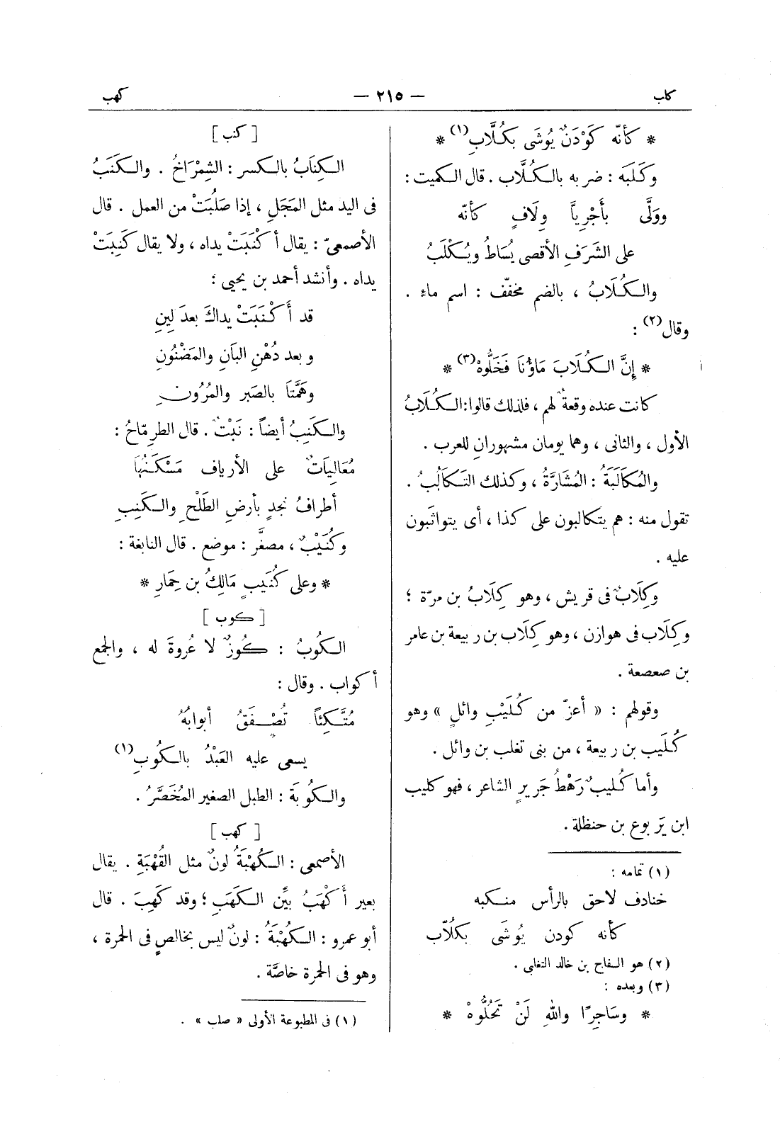* كأنه كودن يوشى بكلاب (¬1) * وكَلَبَهُ: ضربه بالكُلاَّب. قال الكميت: ووَلَّى بأجْرِيَّا وِلافٍ كأنَّه * على الشرف الاقصى يساط ويكلب والكلاب، بالضم مخفف: اسم ماء. وقال (¬2) :