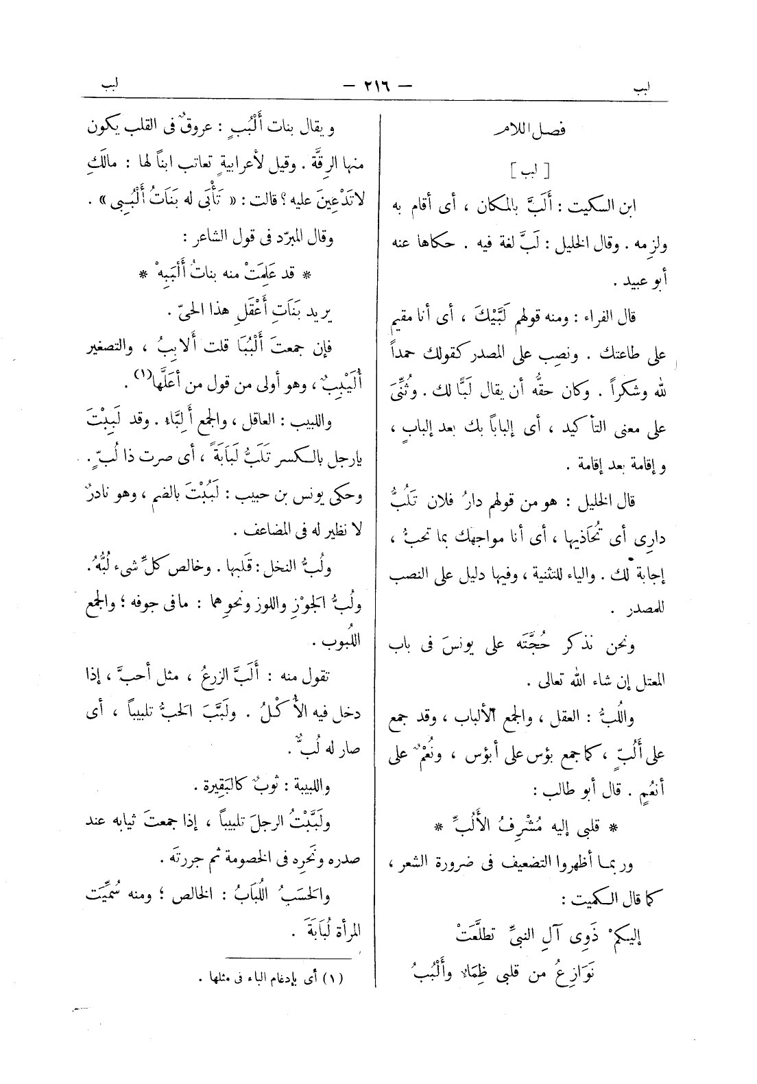 [لبب] ابن السكيت: ألَبَّ بالمكان، أي أقام به ولزِمه. وقال الخليل: لب لغة فيه. حكاها عنه أبو عبيد. قال الفراء: ومنه قولهم لَبَّيْكَ، أي أنا مقيم على طاعتك. ونُصب على المصدر كقولك حمداً لله وشكراً. وكان حقُّه أن يقال لبا لك. وثنى على معنى التأكيد، أي إلباباً بك بعد إلبابٍ، وإقامة بعد إقامة. قال الخليل: هو من قولهم دارُ فلان تَلُبُّ داري أي تُحاذيها، أي أنا مواجهك بما تحب، إجابة لك. والياء للتثنية، وفيها دليل على النصب للمصدر. ونحن نذكر حجته على يونس في باب المعتل إن شاء الله تعالى. واللب: العقل، والجمع الألباب، وقد جمع على ألب، كما جمع بؤس على أبؤس، ونعم على أنعم. قال أبو طالب: