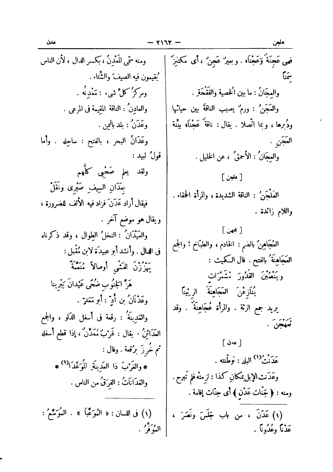 (*) ومنه سمى المعدن، بكسر الدال، لأن الناس يُقيمون فيه الصيفَ والشِّتاء. ومركزُ كلِّ شئ: معدنه. والعادن: الناقة المقيمة في المرعى. وعدن: بلد باليمن. وعدان البحر، بالفتح: ساحله. وأما قول لبيد: ولقد يعلم صحبى كلهم * بعدان السيف صبرى ونقل فيقال أراد عدن فزاد فيه الالف للضرورة، ويقال هو موضع آخر. والعيدان: النخل الطوال، وقد ذكرناه في الدال. وأنشد أبو عبيدة لابن مقبل: يهززن للمشى أوصالا منعمة * هز الجنوب ضحى عيدان يبرينا وعدنان بن أد: أبو معد. والعدينة: رقعة في أسفل الدَلو، والجمع العَدائِنُ. يقال: غَرْبٌ مُعَدَّنٌ، إذا قطع أسفله ثم خُرِزَ برُقعة. وقال: