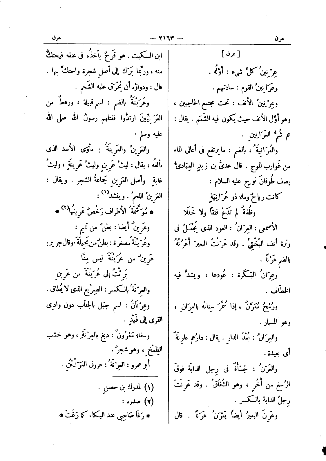 [عرن] عرنين كل شئ: أوله. وعَرانينُ القوم: سادتهم. وعْرنينُ الأنف: تحت مجمع الحاجبين، وهو أول الأنف حيث يكون فيه الشَمَم. يقال: هم شُمُّ العَرانينَ. والعُرانِيةُ، بالضم: ما يرتفع في أعالي الماء من غَوارب الموج. قال عديُّ بن زيدٍ العِباديُّ يصف طوفانَ نوحٍ عليه السلام: كانت رياحٌ وماءٌ ذو عُرانِيَةٍ * وظُلمةٌ لم تَدَعْ فتقاً ولا خَللا الأصمعي: العِرانُ: العود الذي يُجْعَلُ في وترة أنف البُخْتِيِّ. وقد عرنت البعير أعرنه بالضم عرنا. وعران البكَرة: عودها، ويشدُّ فيه الخطّاف. ورُمْحٌ مُعَرَّنٌ، إذا سُمِّرَ سِنانُه بالعِرانِ، وهو المسمار. والعِرانُ: بُعْدُ الدار. يقال: دراهم عارنة أي بعيدة. والعَرَنُ: جُسْأَةٌ في رِجل الدابة فوقَ الرُسغ من أُخُرٍ، وهو الشُقاقُ. وقد عَرِنَتْ رِجلُ الدابة بالكسر. وعَرِنَ البعيرُ أيضاً يعرن عرنا. قال