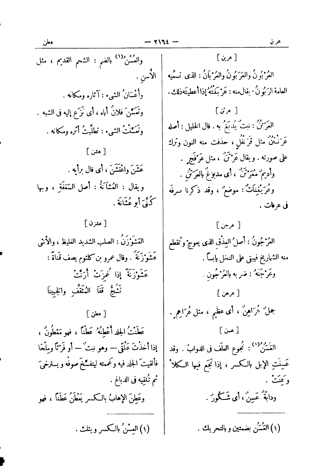 (*) والعسن (¬1) بالضم: الشحم القديم، مثل الأُسنِ. وأعسان الشئ: آثاره ومكانه. وتعسن فلانٌ أباه، أي نَزَع إليه في الشبه. وتعسنت الشئ: تطلبت أثره ومكانه.
