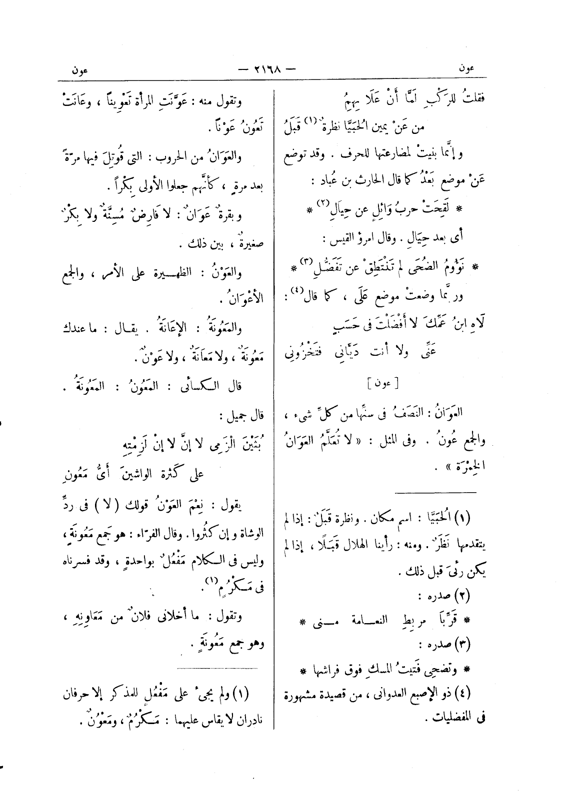 (*) وتقول منه: عونت المرأة تَعْويناً، وعانَتْ تَعونُ عَوْناً. والعَوانُ من الحروب: التي قوتِل فيها مرةً بعد مرّة، كأنَّهم جعلوا الأولى بِكْراً. وبقرةٌ عوانٌ: لا فارِضٌ مُسِنَّةٌ ولا بكرٌ صغيرةٌ، بين ذلك. والعَوْنُ: الظهيرة على الأمر، والجمع الأعْوانُ. والمَعونةُ: الإعانةُ. يقال: ما عندك معونةٌ، ولا مَعانةٌ، ولا عَوْنٌ. قال الكسائي: المعون: المعونة. قال جميل: بثين الزمى لا إن لا إن لزمته * على كثرة الواشين أي معون يقول: نعم العون قولك (لا) في رد الوشاة وإن كثروا. وقال الفراء: هو جمع معونة، وليس في الكلام مفعل بواحدة، وقد فسرناه في مكرم (¬1) . وتقول: ما أخلانى فلانٌ من مَعاوِنِهِ، وهو جمع معونة.
