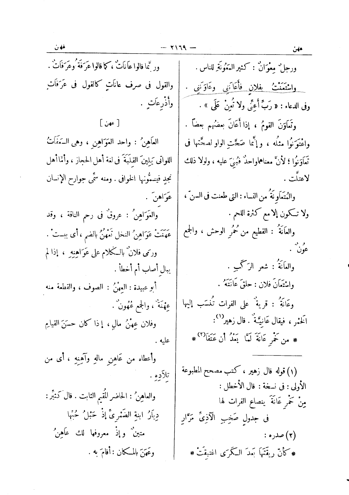 [عهن] العاهِنُ: واحد العواهن، وهي السَعَفاتُ اللواتي يلين القِلَبَةَ في لغة أهل الحجاز، وأما أهل نجد فيسمونها الخوافي. ومنه سمِّي جوارح الإنسان عَواهنَ. والعَواهِنُ: عروقٌ في رحم الناقة، وقد عَهَنَتْ عَواهِنُ النخل تَعْهَنُ بالضم، أي يبستْ. ورمى فلانٌ بالكلام على عَواهِنِهِ، إذا لم يبالِ أصاب أم أخطأ. أبو عبيدة: العِهْنُ: الصوف، والقطعة منه عِهْنَةٌ، والجمع عُهونٌ. وفلان عِهْنُ مالٍ، إذا كان حسن القيام عليه. وأعطاه من عاهِنِ مالهِ وآهِنِهِ، أي من تِلادِهِ. والعاهِنُ: الحاضر المقيم الثابت. قال كثيّر: ديارُ ابنةِ الضَمْرِيِّ إذ حَبْلُ حُبّها * متينٌ وإذْ معروفها لك عاهِنُ وعَهَنَ بالمكان: أقام به.