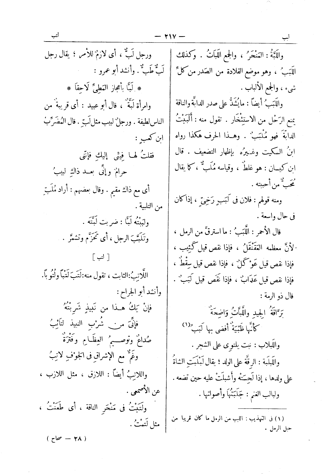 لَبًّا بأعجاز المَطِيِّ لاحقا * وامرأة لَبَّةٌ، قال أبو عبيد: أي قريبة من الناس لطيفة. ورجلٌ لبيب مثل لَبٍّ. قال المُضَرِّبُ ابن كعبٍ: فقلتُ لها فِيئي إليكِ فإنَّني * حرامٌ وإنِّي بعد ذاكَ لبيبُ أي مع ذاك مقيم. وقال بعضهم: أراد ملب من التلبية. ولببته لبا: ضربت لَبَّتَه. وتَلَبَّبَ الرجل، أي تحزم وتشمر.