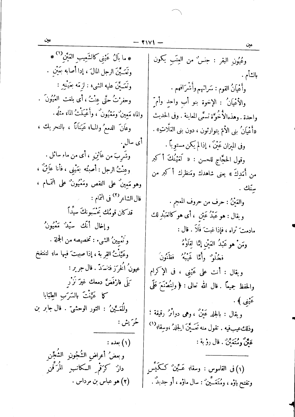 (*) * ما بال عينى كالشَعيبِ العَيِّنِ (¬1) * وتَعَيَّنَ الرجل المالَ، إذا أصابه بعَيْن. وتَعَيَّنَ عليه الشئ: لزمه بعينه: وحفرت حتى عِنْتُ، أي بلغت العُيونَ. والماء معينٌ ومَعْيونٌ، وأعْيَنْتُ الماء مثله. وعان الدمع والماء عينانا، بالتحريك، أي سال. وشربَ من عائنِ، أي من ماء سائل. وعِنْتُ الرجل: أصبته بعينى، فأنا عائنٌ، وهو مَعينٌ على النقص ومَعْيونٌ على التمام، قال الشاعر (¬2) في التمام: قد كان قومك يحْسَبونكَ سيِّداً * وإخال أنَّك سيِّدٌ معيون وتعيين الشئ: تخصيصه من الجملة. وعَيَّنْتُ القِربة، إذا صببت فيها ماءً لتنتفخ عيونُ الخرز فتنسدّ. قال جرير: بلى فارْفَضَّ دمعك غيرَ نَزْرٍ * كما عَيَّنْتَ بالسَرَبِ الطِبابا والمُعَيَّنُ: الثور الوحشي. قال جابر بن حريش